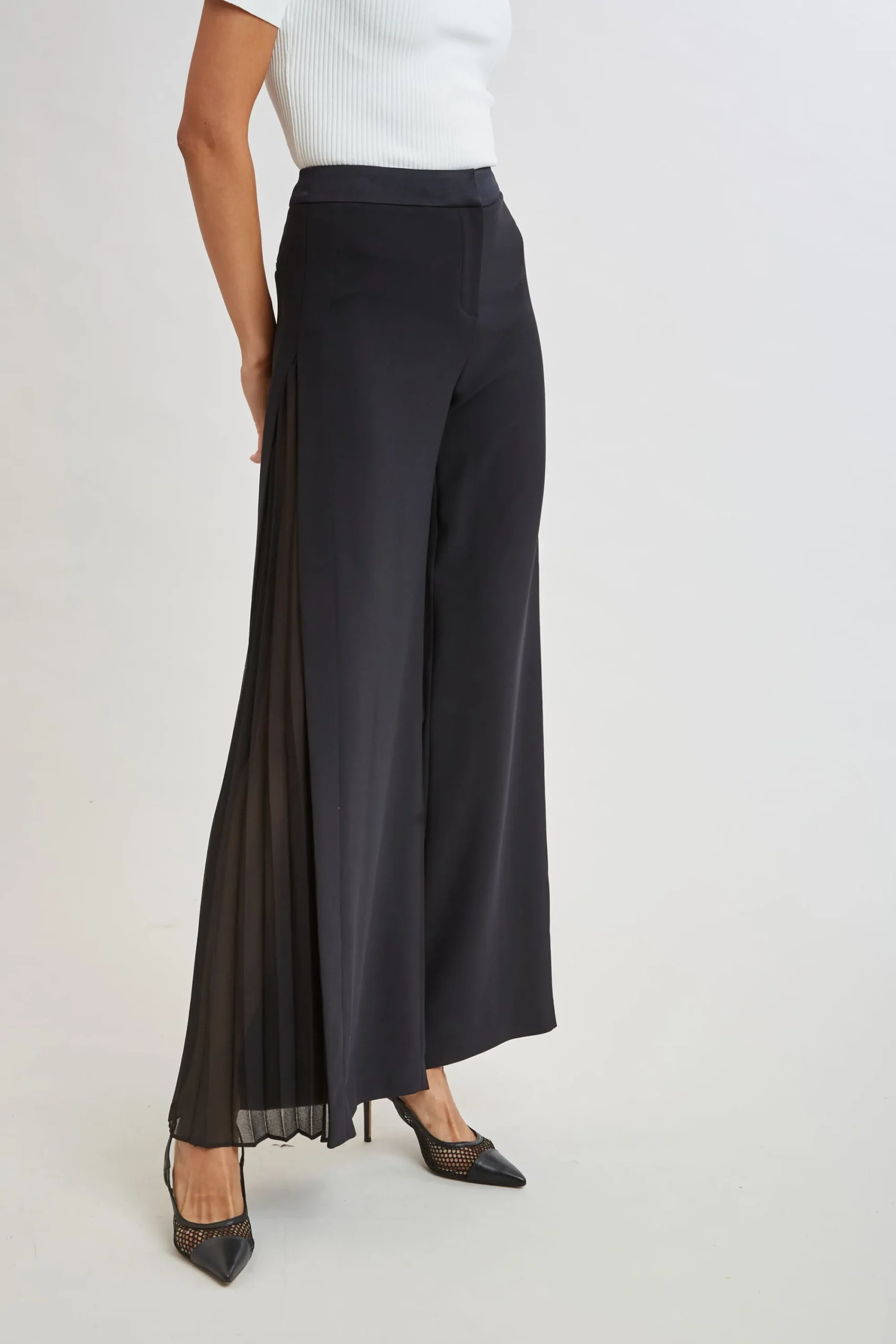 Elevate your style with our modern Crepe Wide Leg Pant. Designed with pleated georgette side panels, this pant offers a sophisticated silhouette and effortless movement. Limited Edition 50th Anniversary Collection Elie Tahari Exclusive Wide Leg Crepe Pants with Side Pleat Detailing 100% Polyester Runs true to Size Measurements: 11.5″L Front Rise, 32.5″L Inseam (approx. length for a size 6) Model is 5’9″ and wearing size 2 Dry Clean Only Imported Style #: E903N204
