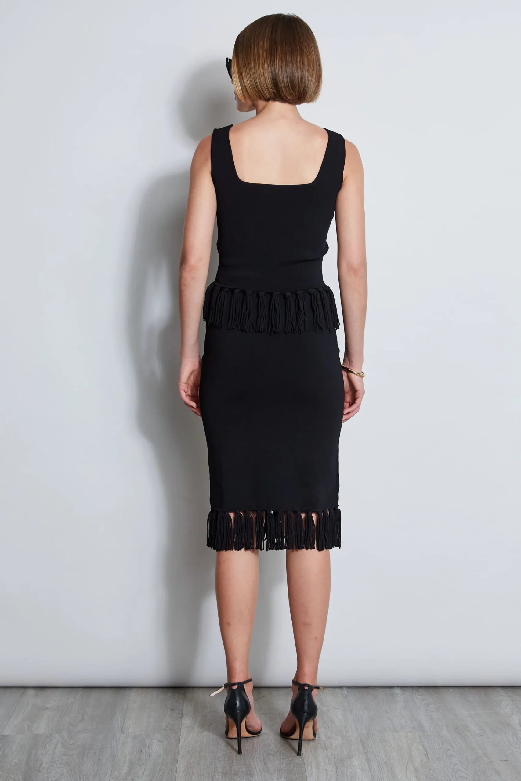 Versatile and undeniably chic, our knit skirt has the cool factor you are looking for. Figure skimming, comfortable u0026amp; decidedly cool, its chic minimalist design features an edgy fringe hem -perfect for day to dinner. Wear it as a separate or with its matching Fringe Hem Sweater. Knee Length Knit Sweater with Fringe Hem 64% Viscose, 22% Nylon, 14% Polyester Runs True to Size Model is 5’9″ and wearing size S Imported Dry clean only Style #: ETR41350