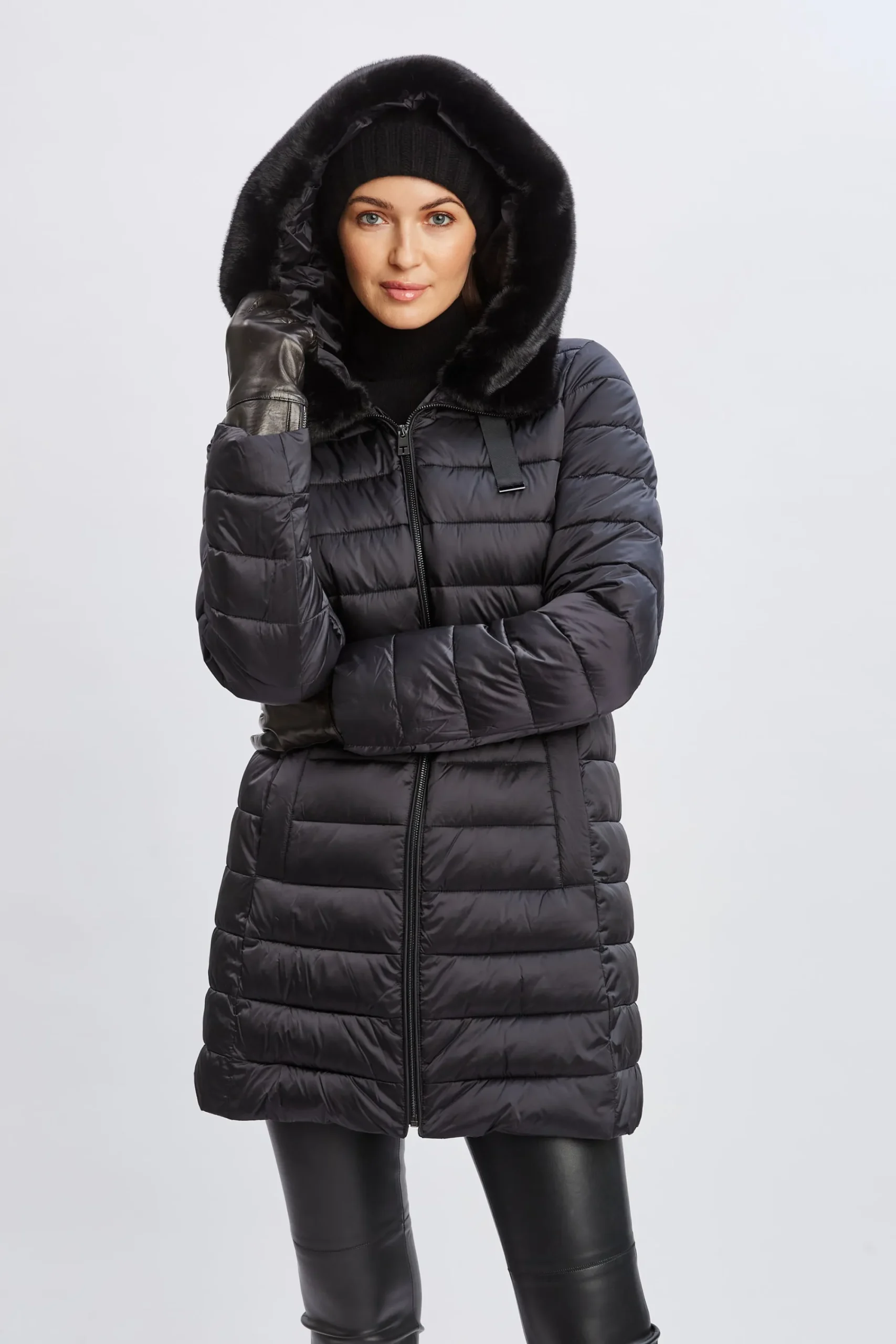 Stay warm all winter long in our best-selling Tahari Stitched Faux Fur Puffer Coat. With its faux fur trimmed collar, this mid-length Puffer coat features channel stitching throughout and is a must-have for when the temperature drops. Mid Length Puffer Coat with channel stitching, attached hood u0026amp; faux fur trim Runs true to Size Model is 5’9″ and wearing size S Dry Clean Only Imported Style #: 124001304