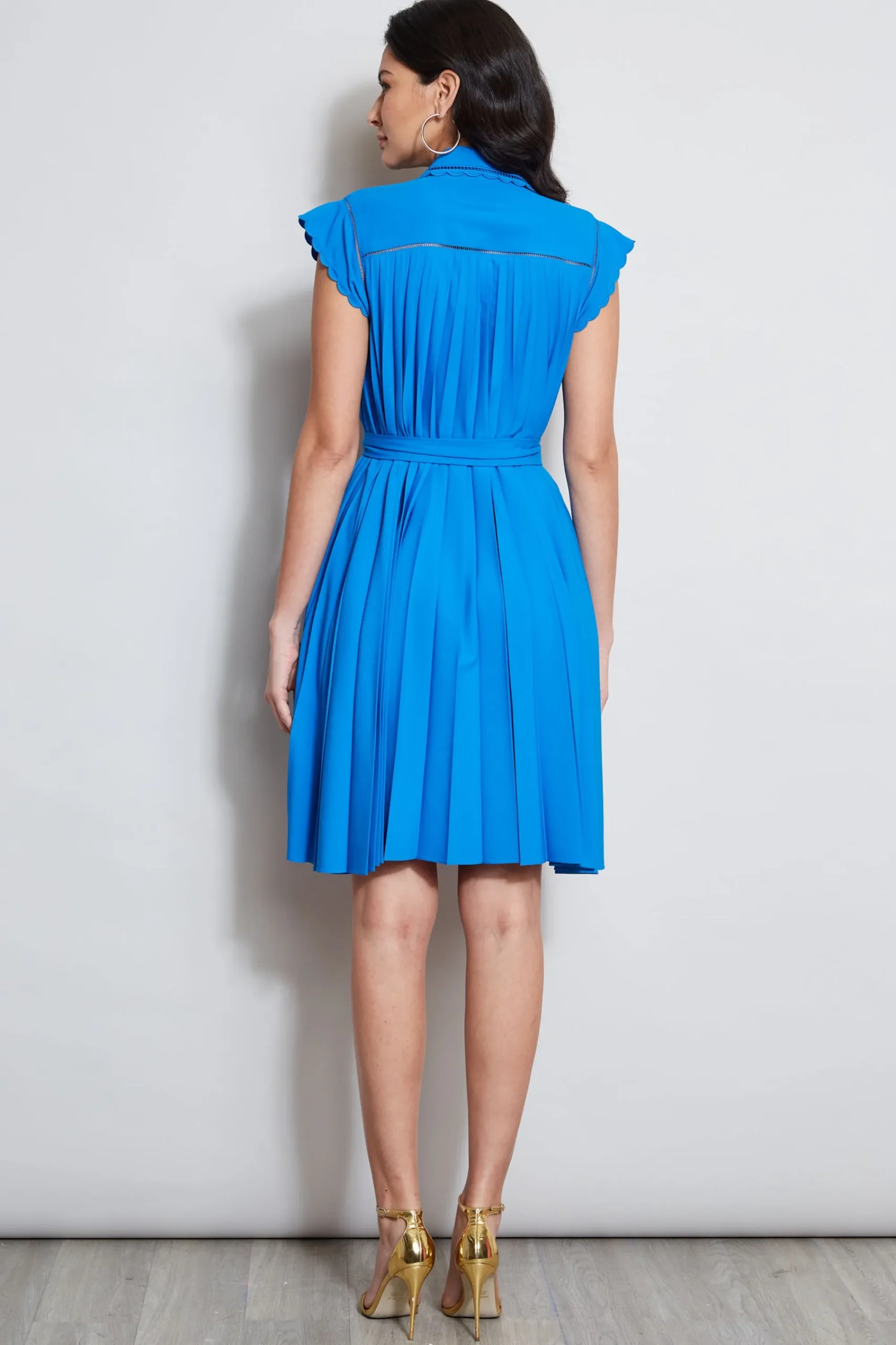 The easiest shirt dress is elevated with accordion pleading that begins at the shoulder and extends to the hem. Designed with scallop edges on the sleeve, collar u0026amp; placket, cinch the waist with its self-sash belt. Pleated Collared Dress with Self-Sash u0026amp; Scallop Detailing 91% Polyester, 9% Spandex Runs true to size. Model is 5’9″ and wearing size S Measurements: 40″ L Shoulder to Hem (approx. measurement for size 6) Imported Style # ETR41148