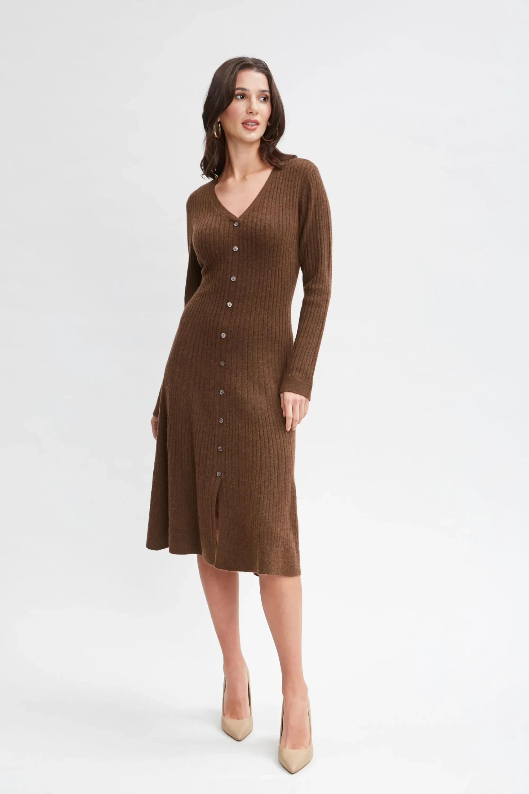 Our luxe Cashmere Dress is an elevated take on Fall’s knit dress trend. Featuring a Fit u0026amp; Flare silhouette a v-neckline u0026amp; buttons down the front, it is ultra-versatile u0026amp; can be easily dressed up with heels or down with knee grazing boots. Long Sleeve Cashmere Fit u0026amp; Flare Button Down Dress Runs true to Size Model is 5’9″ and wearing size S Dry Clean Only Imported Style #: ETR44243