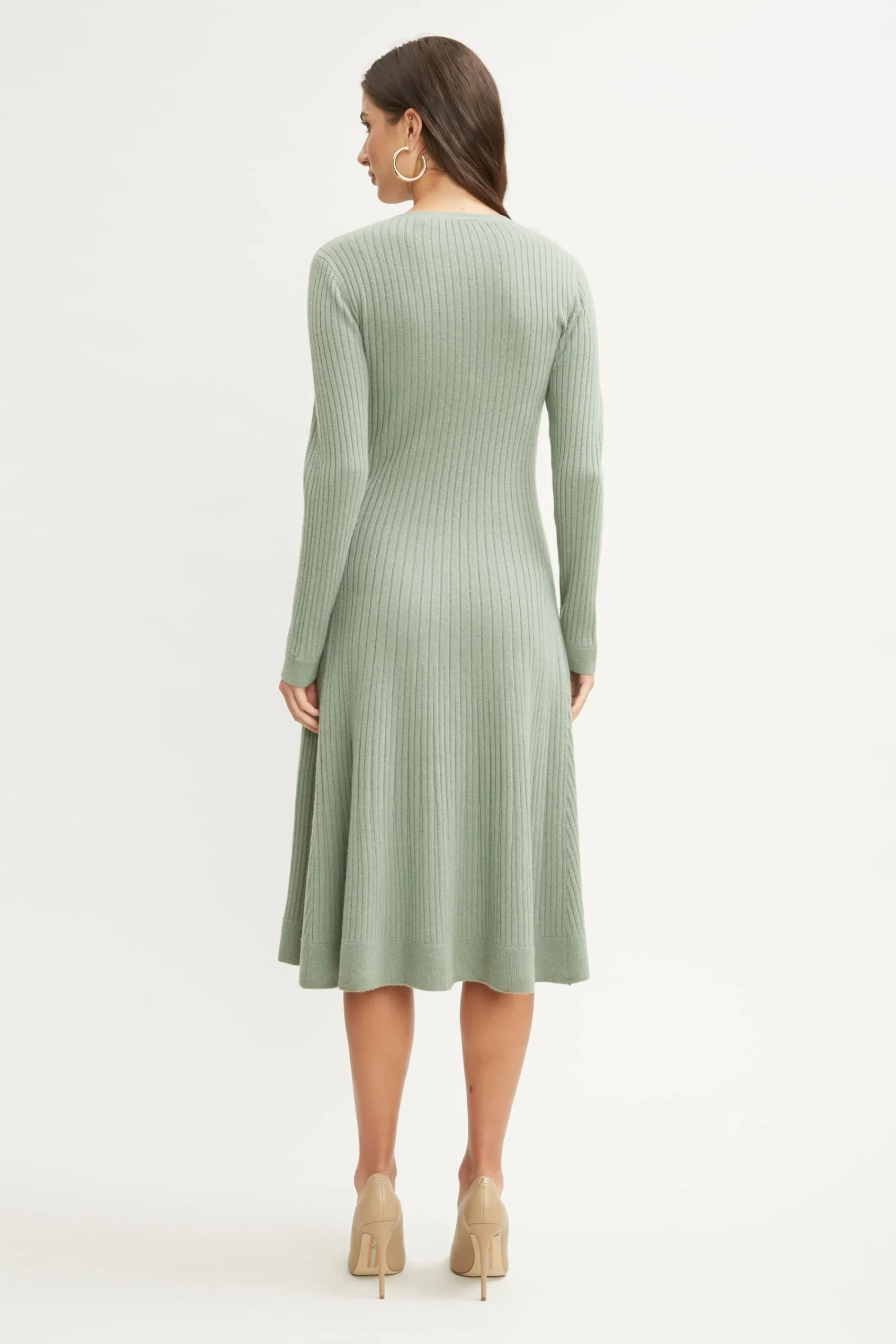 Our luxe Cashmere Dress is an elevated take on Fall’s knit dress trend. Featuring a Fit u0026amp; Flare silhouette a v-neckline u0026amp; buttons down the front, it is ultra-versatile u0026amp; can be easily dressed up with heels or down with knee grazing boots. Long Sleeve Cashmere Fit u0026amp; Flare Button Down Dress Runs true to Size Model is 5’9″ and wearing size S Dry Clean Only Imported Style #: ETR44243