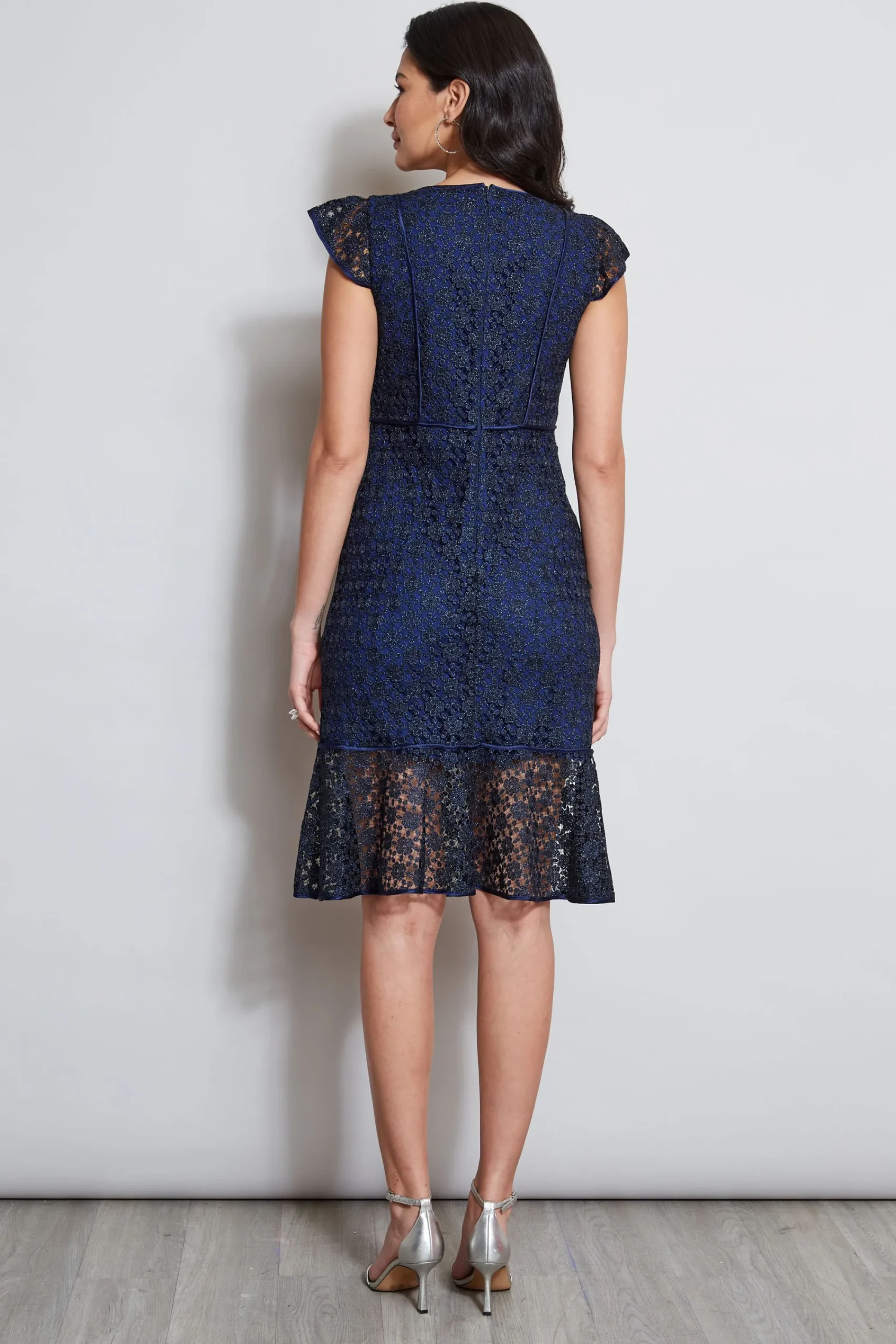 We chose a chic metallic Lace in a delicate floral design for our Cocktail Dress. The Satin lining, soft flutter sleeve and flounced hem add dimension to this sophisticated Lace Midi Dress. Elie Tahari Exclusive Ruffle Sleeve Floral Lace Fit u0026amp; Flare Midi Dress 75% Polyester, 25% Metallic Yarn Runs true to size. Model is 5’9″ and wearing size 2 Length From Shoulder to Hem: Back 42.25, Sleeve 3.75″L (approx. length for size 6) Imported Style #: E202J604