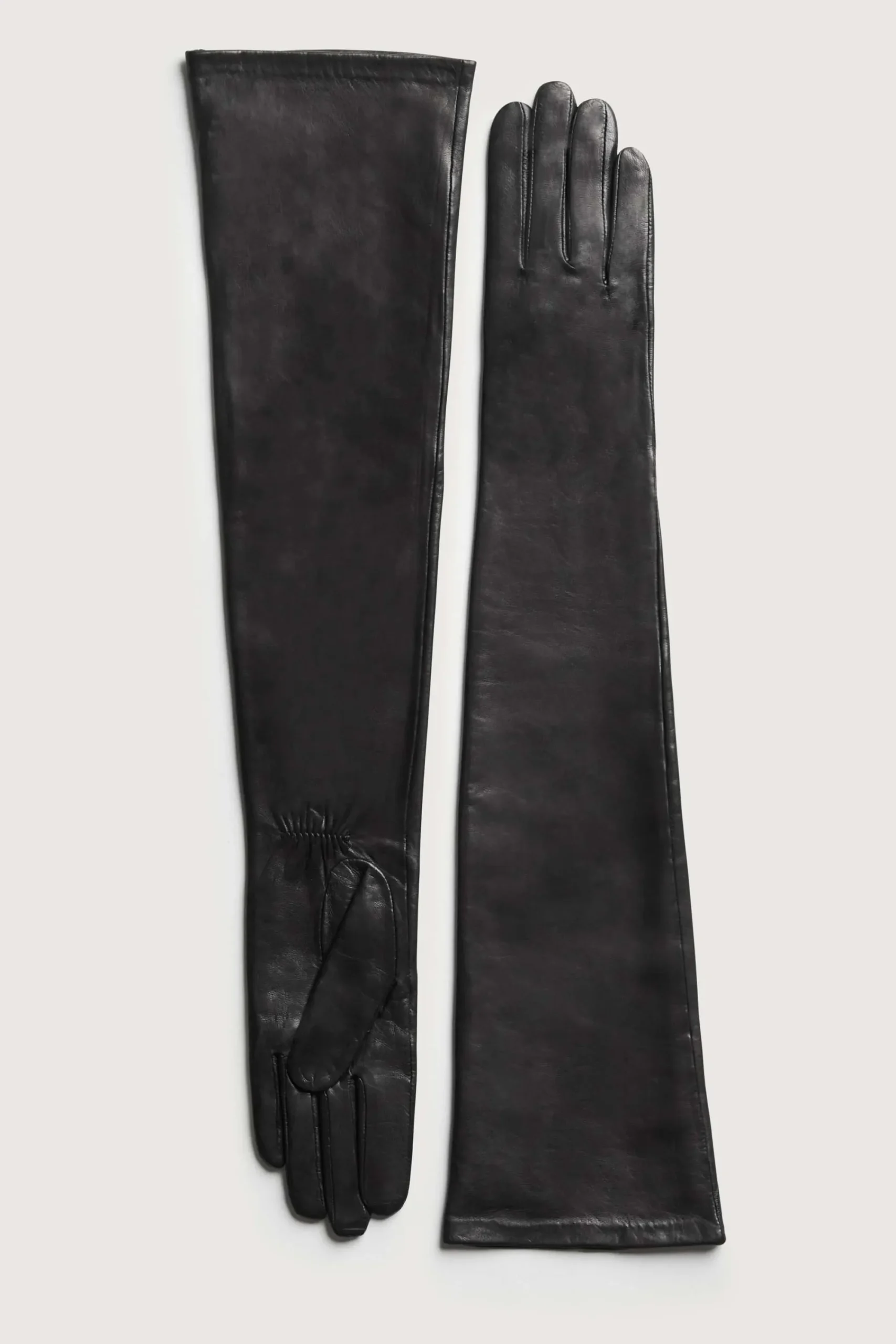 Make a statement this Fall in our Opera Gloves. Made in luxe Nappa Leather, our above elbow length gloves are the chic addition your evening wardrobe needs. Elie Tahari Exclusive Long Leather Gloves 100% Leather Runs true to Size Model is wearing size S/M Dry Clean Only Imported Style #: A905H404