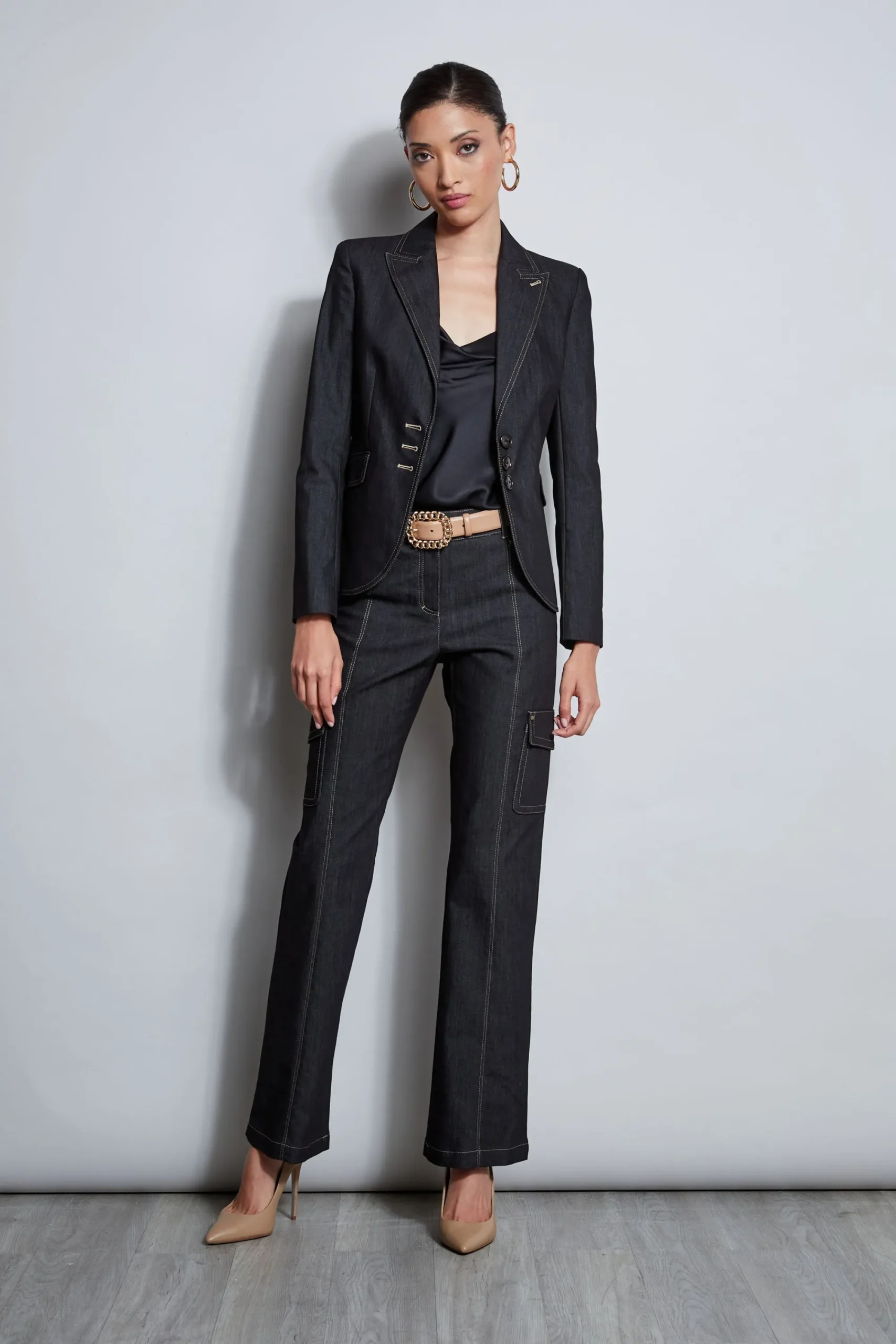 With modern lean lines and sharp tailoring, the denim blazer is an essential in your fall wardrobe rotation. Done in luxe stretch denim, single breasted with peaked lapels, contrast caramel stitching and an impeccable cut, it has the cool factor you are looking for in your new favorite blazer. Pair it with its matching pant or wear it as a separate. Three-Button, Mid-Length Denim Blazer 74% Cotton, 24% Polyester, 2% Elastane Runs true to size. Model is 5’9″ and wearing size 2 Length From Shoulder to Hem: Back 22.25″L, Sleeve 24.5″L (approx. length for size 6) Dry Clean Only Imported Style #: ED02P103
