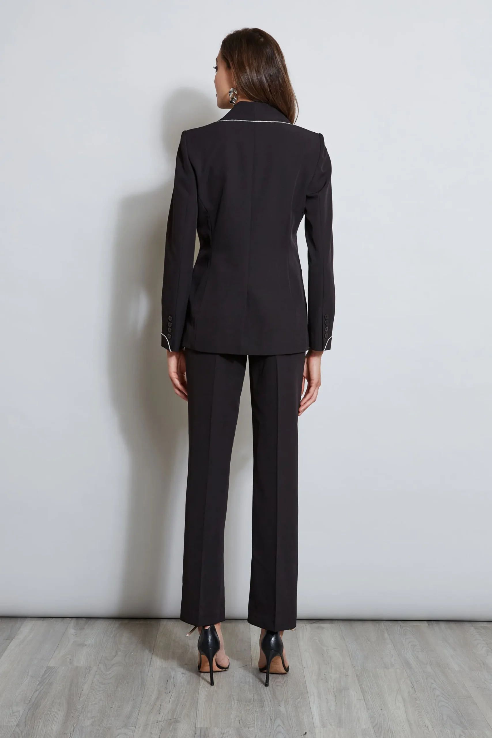 Our rhinestone edged Blazer has the designer touch. With a shawl collar u0026amp; single button closure, this jacket is elevated with rhinestone trim at the collar u0026amp; cuffs. Wear it casually with vegan leather or pair it with its matching pant for the seasons must have matched suit. Single Button Blazer with Rhinestone Trim Runs true to Size 91% Polyester, 9% Spandex Measurements: About 26.25 ” from shoulder to hem Model is 5’9″ and wearing size 2 Dry Clean Only Imported Style #: ETR35100
