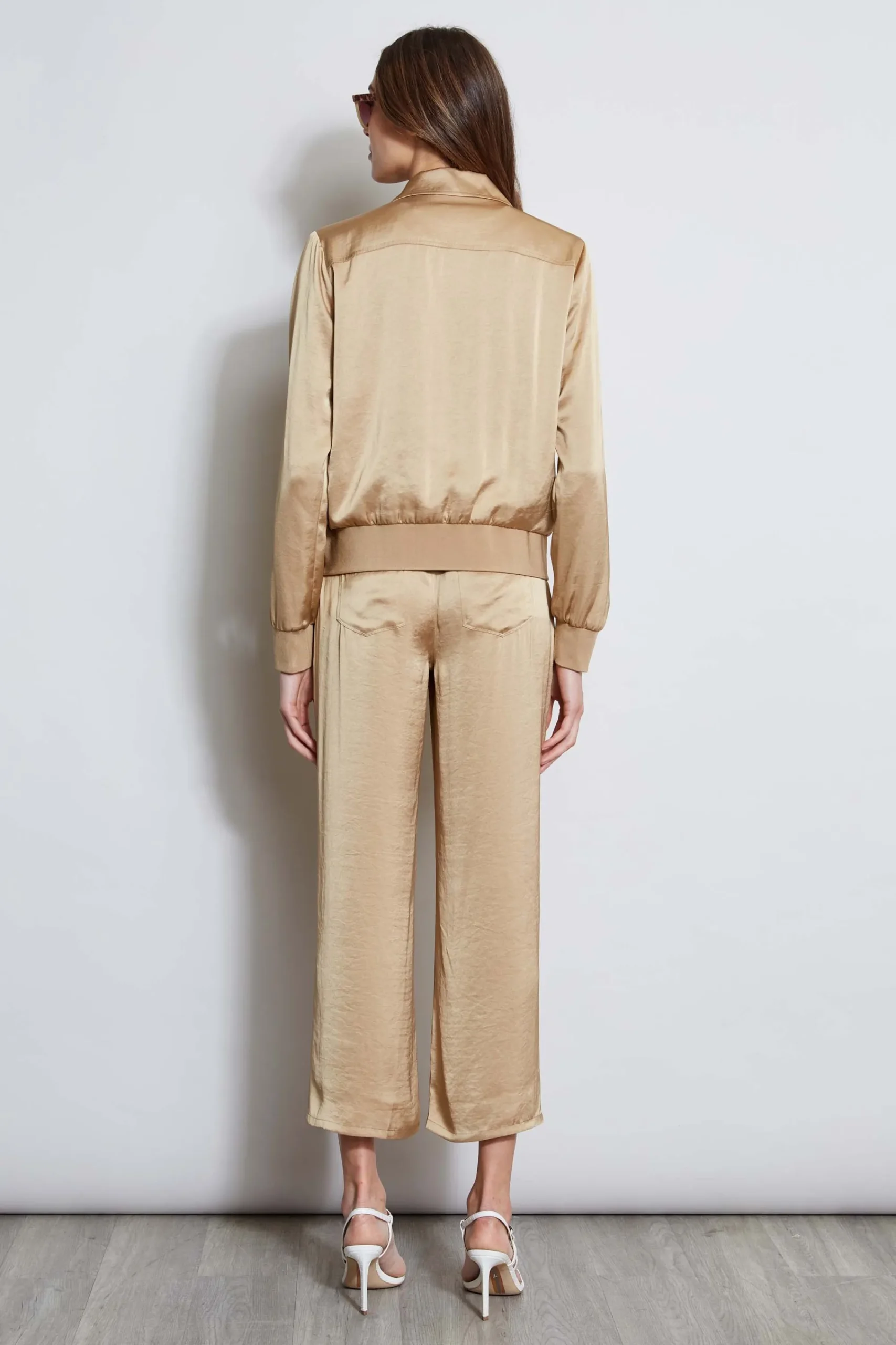 Express yourself in our washed Satin Utility Jacket with its of the moment cargo details. Sporty and chic with its relaxed fit, patch pockets and rib trim, this jacket has the modern versatility you want. Designed in our signature Washed Satin, whether worn with its matching Pant or paired with Denim, meet your next go-to jacket. Elie Tahari Exclusive Washed Satin Jacket with Cargo Pockets 100% Polyester Runs true to size. Model is 5’9″ and wearing size S Measurements: Back 21.75″L, Sleeve 32.75″L (approx. length for size S) Dry Clean Only Imported Style #: E5027104
