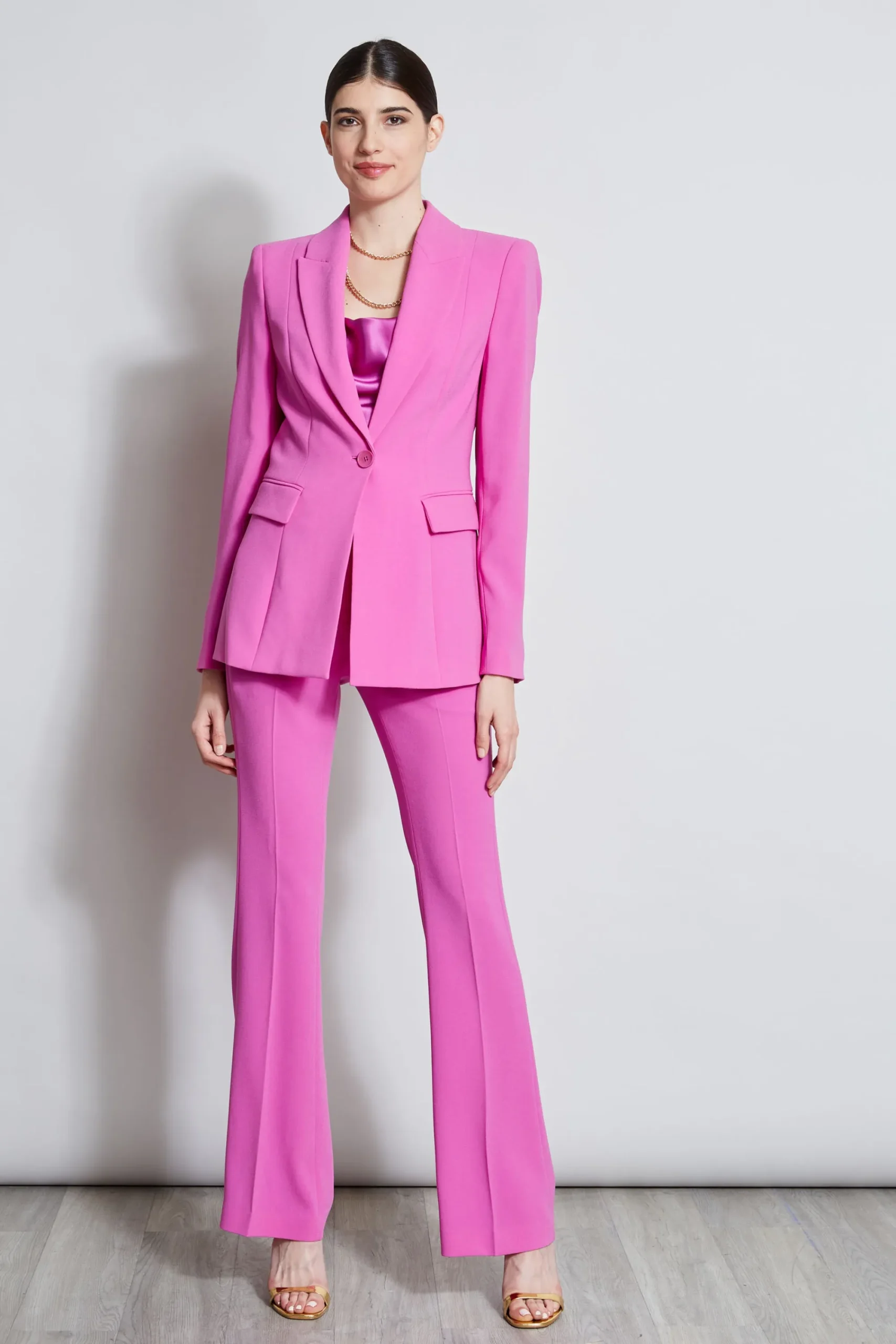 Elie’s signature fitted blazer is chic and polished. Single breasted with peaked lapels and an impeccable cut, it has the cool factor you are looking for in your next favorite blazer. Elie Tahari Exclusive Single-Button Fluid Crepe Blazer 70% Triacetate, 30% Polyester Runs true to size. Model is 5’9″ and wearing size 2 Length From Shoulder to Hem: Back 27.5″L, Sleeve 33.5″L (approx. length for size 6) Dry Clean Only Imported Style #: E1087103