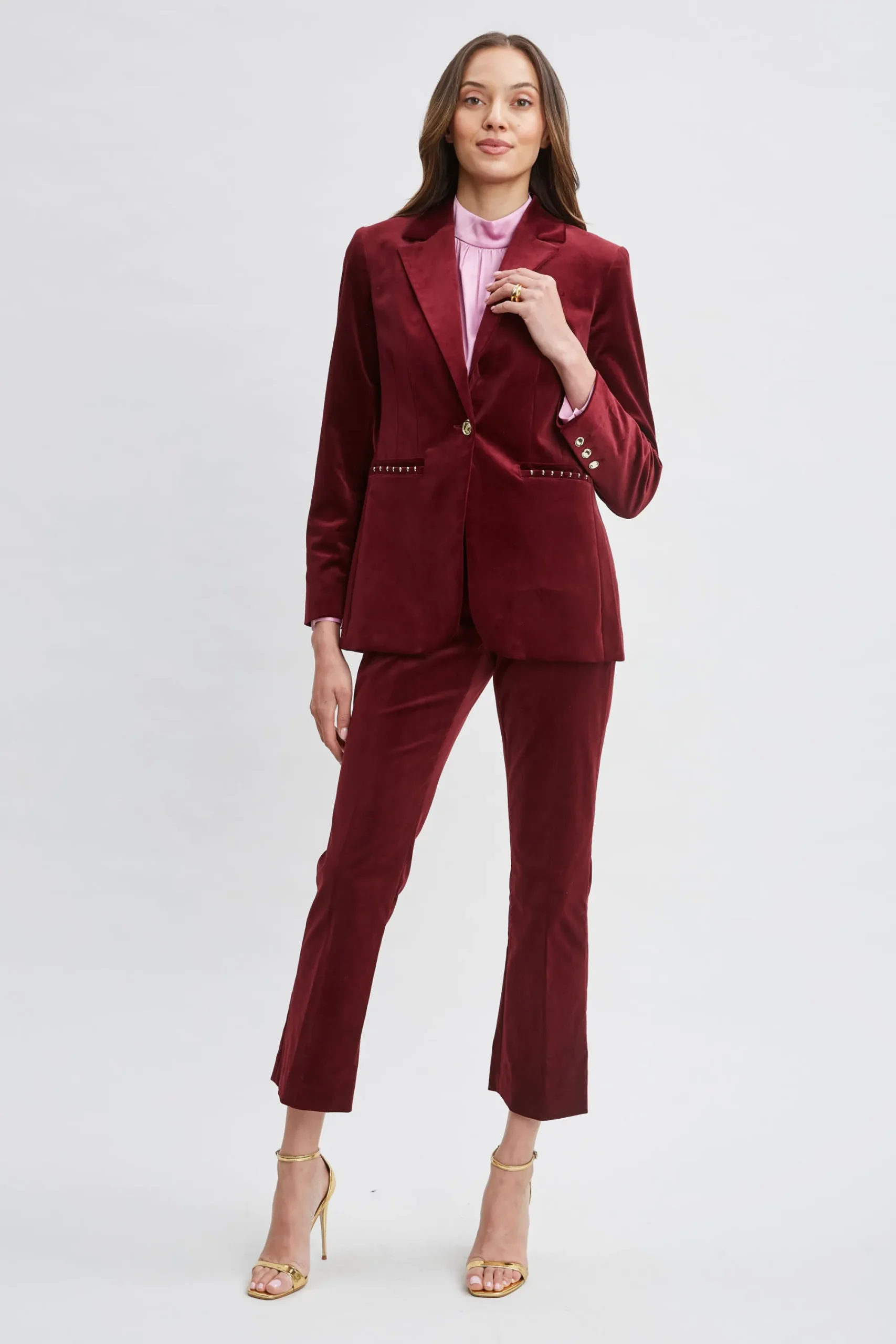 Borrowed from the boys but totally femme, our stretch Velvet Blazer is a must have. Sharp tailoring meets the lush touch and patina of velvet in our peaked lapel One Button Blazer. Designed with gold pocket detailing u0026amp; button closure, think of velvet for day and night and mix it with denim, vegan leather and satin 24/7. Elie Tahari Exclusive Single Button Velvet Blazer with Peak Lapels u0026amp; Gold Detailing 97% Cotton; 3% Elastane Runs true to size. Model is 5’9″ and wearing size 2 Length From Shoulder to Hem: Back 28″ L, Sleeve 32.5″ L (approx. length for size 6) Dry Clean Only Imported Style #: ER075104