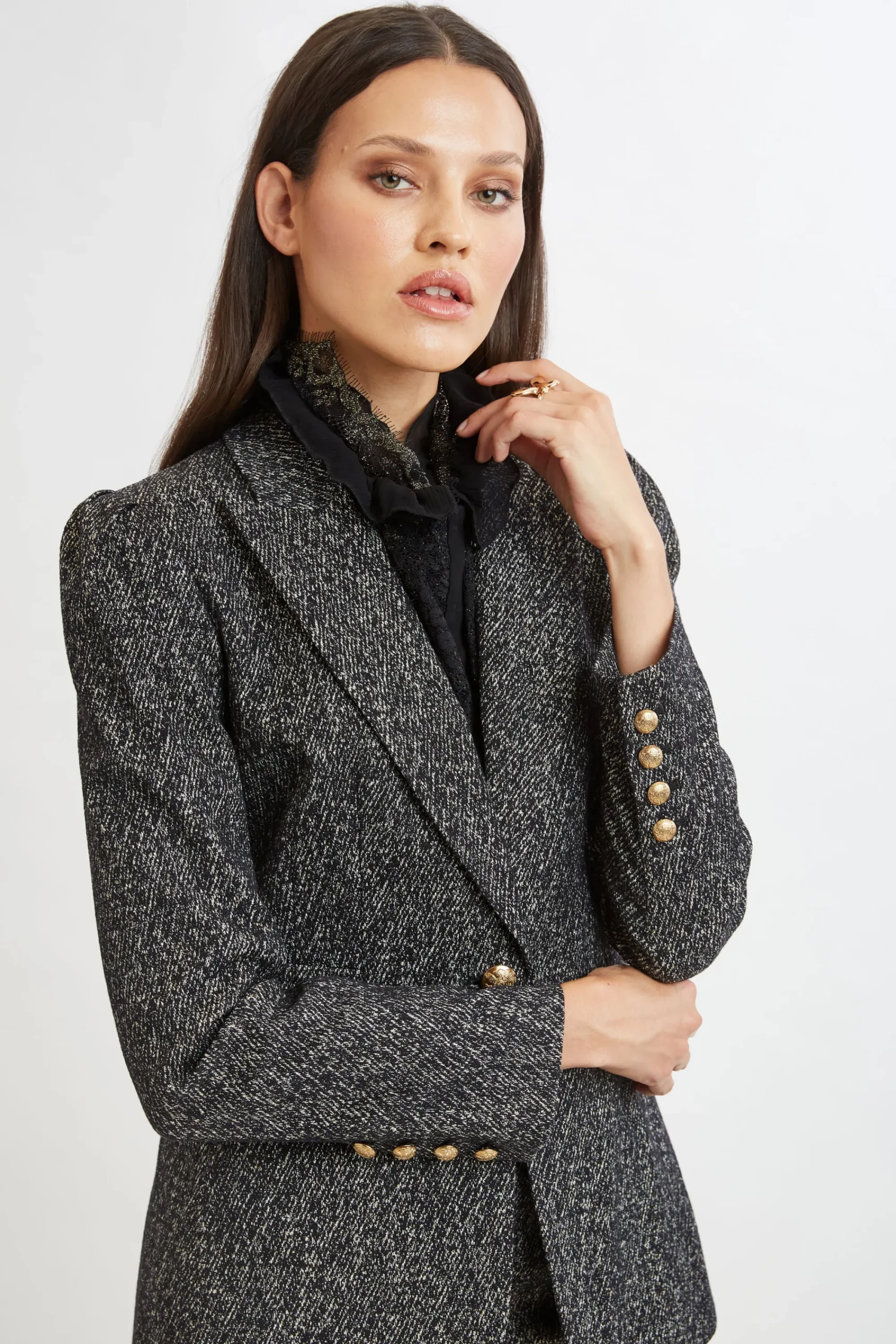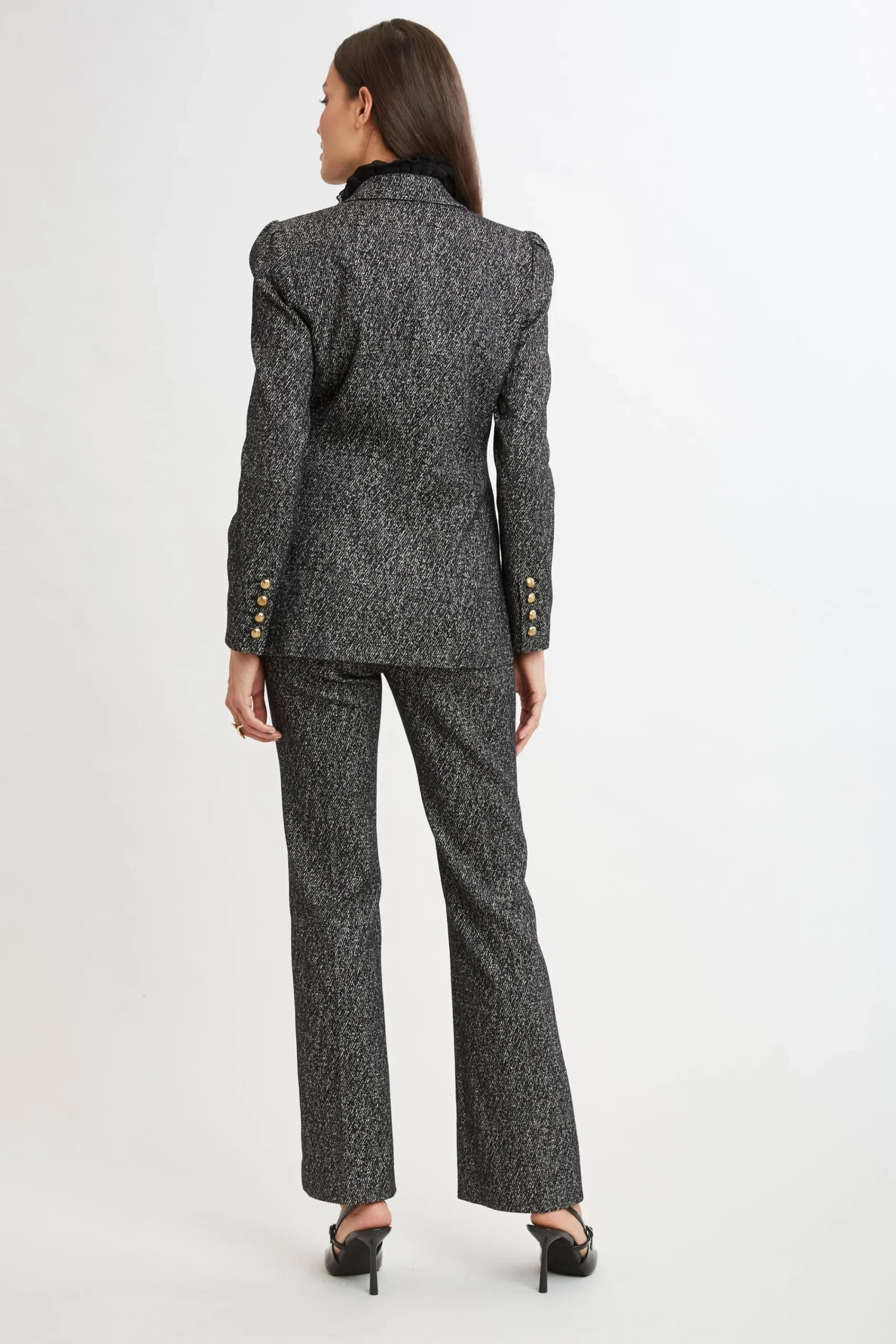 Elevate your Fall wardrobe with our Metallic Kissed Tweed Blazer. The single-breasted design with a gold button exudes sophistication, while the pleat detail shoulder adds a twist of femininity. Pair it with its matching fit-and-flare pant or vegan leather for a polished look. Limited Edition 50th Anniversary Collection Elie Tahari Exclusive Metallic Cotton Twill Single Button Blazer with Puff Shoulder 90% Cotton, 4% Metallic, 3% Elastane, 3% Polyamide Runs true to Size Length From Shoulder to Hem: Back 27.5″L, Sleeve 33″L (approx. length for size 6) Model is 5’9″ and wearing size 2 Dry Clean Only Imported Style #: E9029104