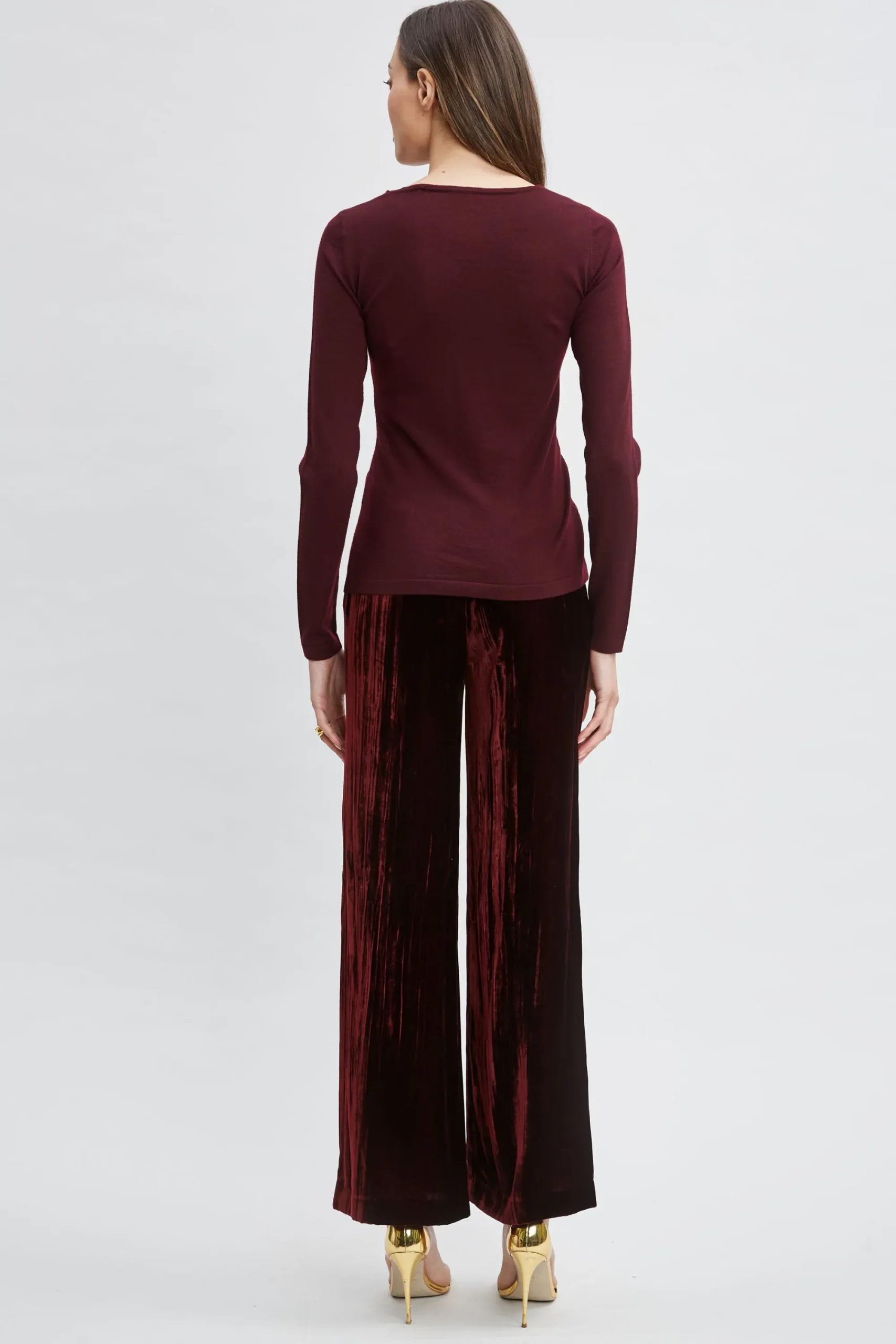 The twist front asymmetric neckline lends an artistic edge to this merino wool sweater while the heat transfer crystals add a touch of shimmer. We’re obsessed with it paired with velvet or denim. Elie Tahari Exclusive Twist Neck Knot Sweater with Heat Transfer Crystals 100% Merino Wool Runs true to size. Model is 5’9″ and wearing size S Length From Shoulder to Hem: Back 24″L, Sleeve 24.5″L (approx. length for size S) Dry Clean Only Imported Style #: ER0X5544