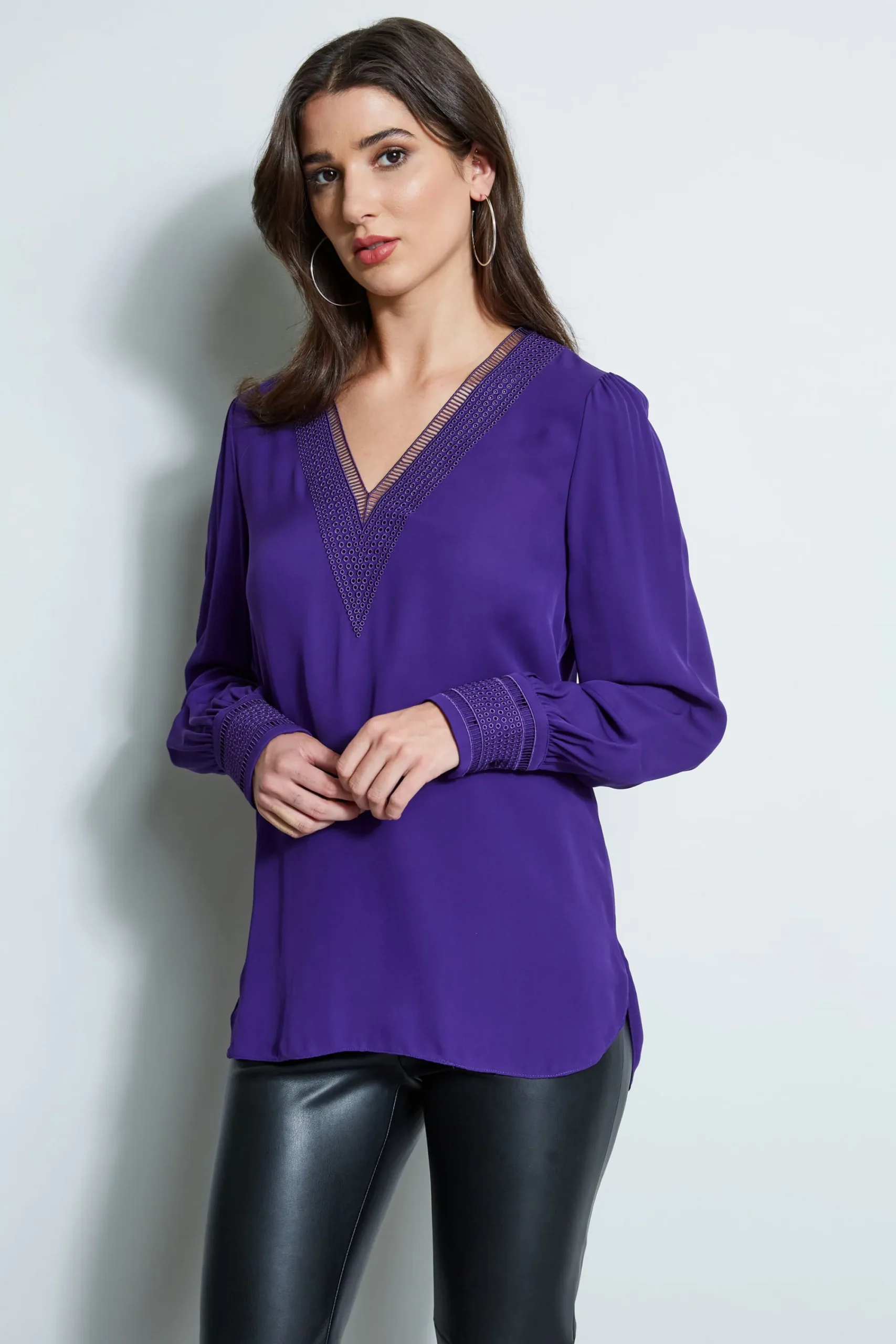 Our Silk Georgette shirt has unique geometric embroidery at the neckline u0026amp; cuffs. The soft poetic sleeves lend a feminine twist. Embroidered V-Neck Silk Long Sleeve Shirt 100% Silk Model is 5’9″ and wearing size S Length From Shoulder to Hem: Back 28″L, Sleeve: 32.5″ L (approx. length for size S) Dry Clean Only Imported Style #: ER10N513