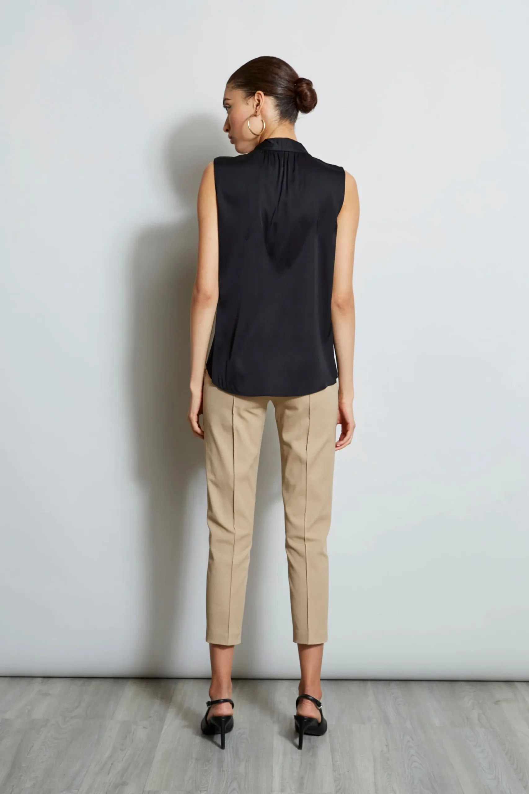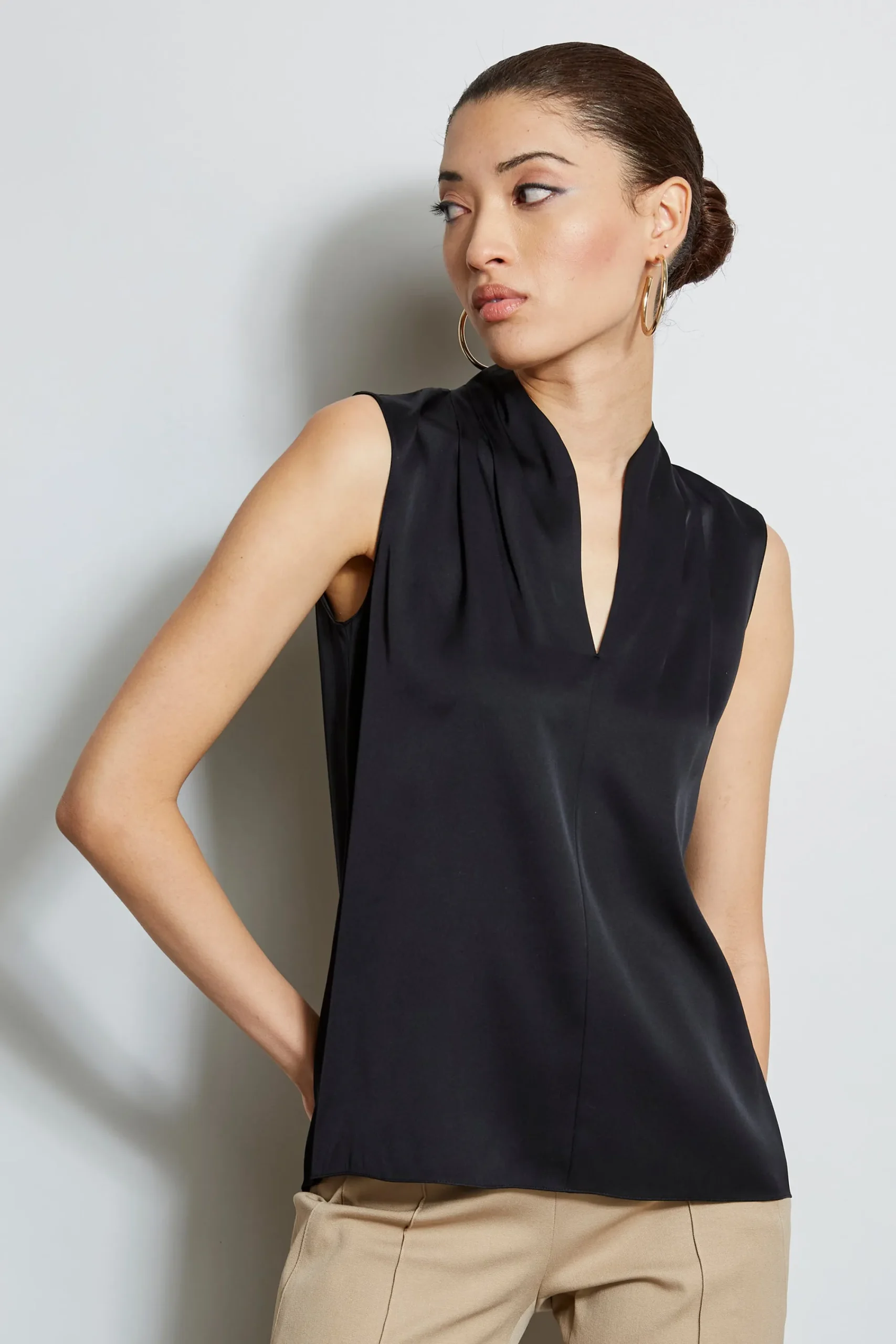Luxurious Silk Georgette elevates this minimalist top. With its contour neckline and soft shoulder pleat detail, this essential piece will take you from Summer into Fall. Sleeveless, pleated shoulder top with stand collar and split neckline 95% Silk, 5% Elastane Relaxed Fit; Runs true to size Model is 5’9″ and wearing a size S Length From Shoulder to Hem: Front 26.25″L; Back 30″L (approx. length for size S) Dry Clean Only Imported Style #: EU8RM50U