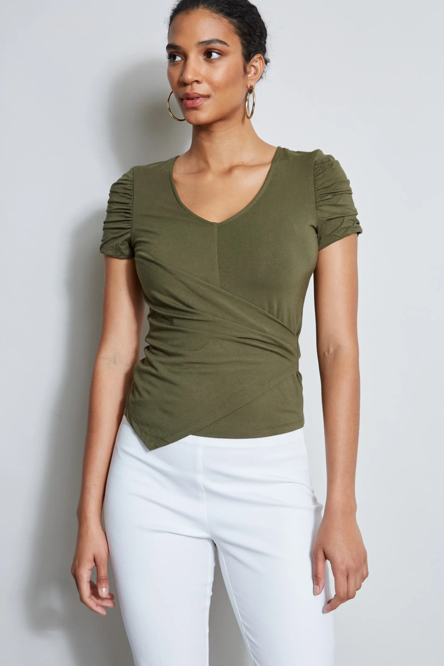 We love the modernity of our V-Neck Puff Sleeve Knit. Effortlessly cool this knit will add fashion and function to your Spring look. Done in luxe Jersey with an asymmetric hem u0026amp; side ruching, this piece adds a design twist to your Tee closet. Elie Tahari Exclusive Short Puff Sleeve Asymmetrical V-Neck Jersey Tee 95% Modal, 6% Elastane Runs true to size. Model is 5’10” and wearing size S Length From Shoulder to Hem: Sleeve 7″L, Back 23.75″L (approx. measurements for size S) Imported Style #: E456X503