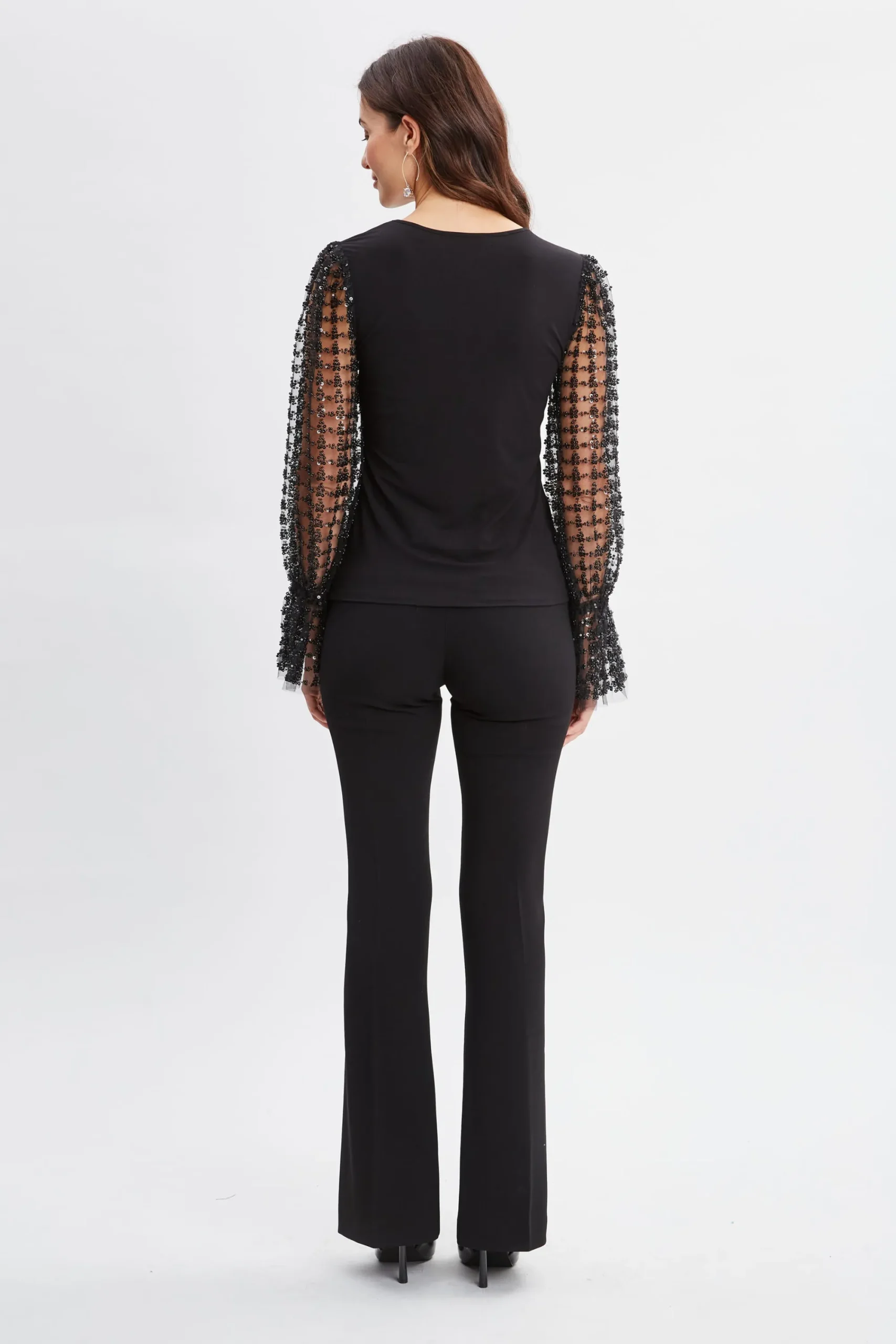 This will be the knit you can’t get out of your head. Eye-catching sequin mesh sleeves in a geometric motif add a design twist to our crewneck long sleeve jersey knit. Dress it up with our overlay pants or down with jeans. Sequin Sleeve Jersey Knit Runs true to Size 95% Rayon, 5% Spandex Model is 5’9″ and wearing size S Dry Clean Only Imported Style #: ETR45213