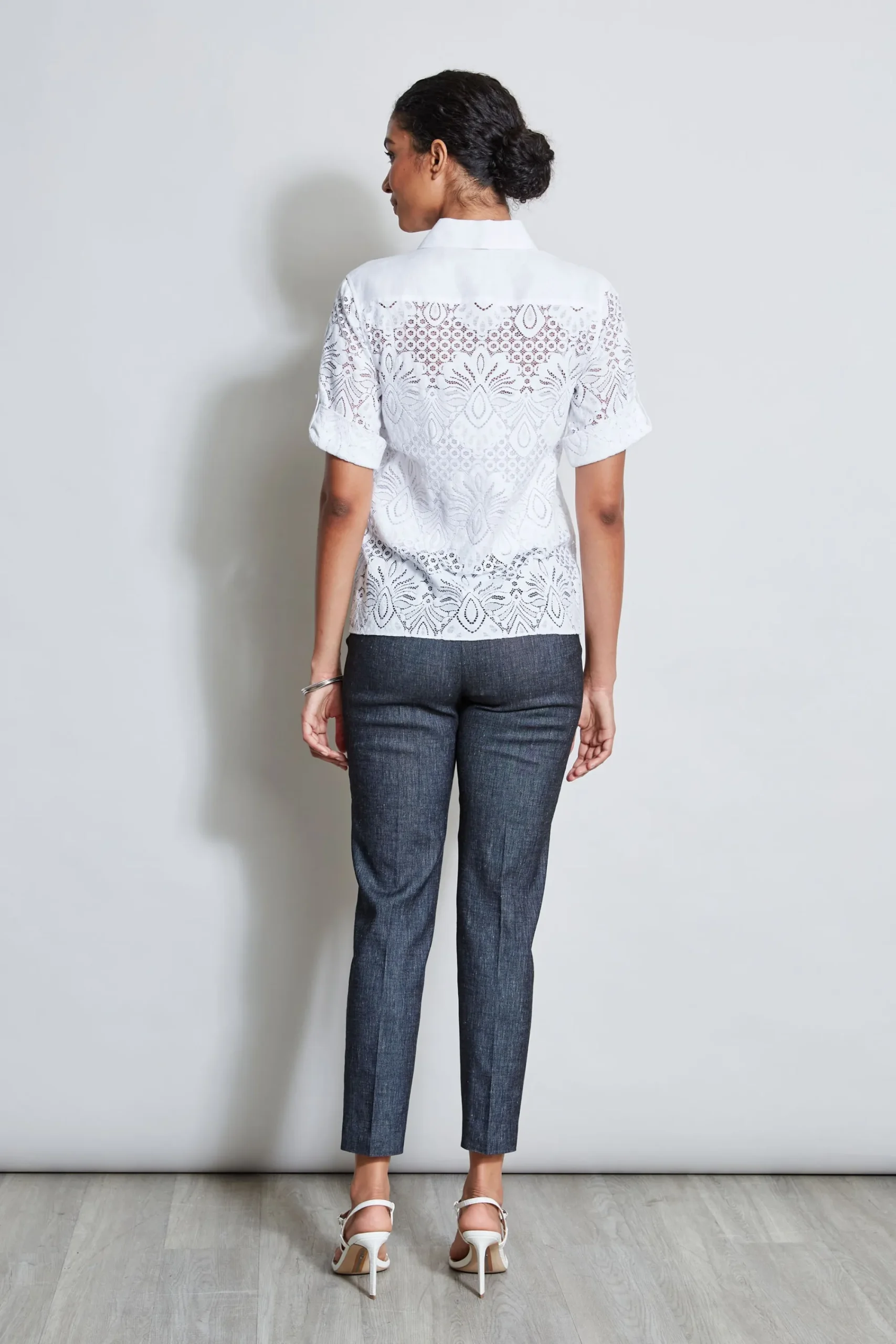 In modern lace, this shirt has a cool vibe. The linen covered button front closure, utility patch pockets u0026amp; open-work lace make it perfect for warm Spring days. Versatile u0026amp; chic, wear it with Elie’s favorite white or denim jeans, or dressed up with our crepe pants. Elie Tahari Exclusive Short Sleeve Lace Button Down Shirt with Utility Chest Pockets 49% Polyamide, 47% Cotton, 4% Elastane Runs true to size. Model is 5’9″ and wearing size S Length From Shoulder to Hem: Back 25.5 “L, Sleeve: 21 “L (approx. length for size S) Dry clean Imported Style #: E403H504