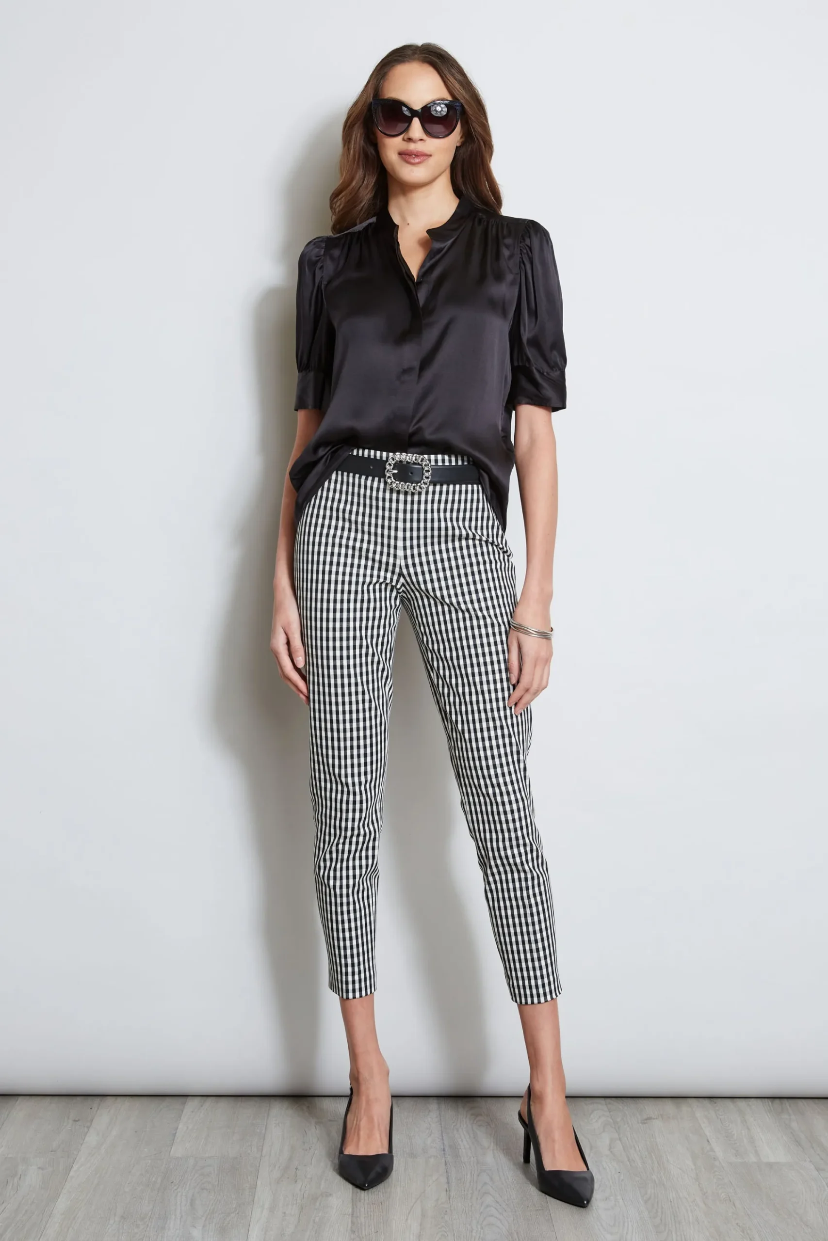Meet Spring’s must have shirt. Silk Satin accents the femme vibe of our band collar shirt with ruched short sleeves. It is perfect for wearing on its own or layering with one of Elie’s standout blazer. Elie Tahari Exclusive Puff Ruched Short Sleeve Silk Satin Top with Band Collar u0026amp; Button Down Silhouette 100% Silk Satin Runs true to size. Model is 5’9″ and wearing size S Length From Shoulder to Hem: Back 24.6″L, Sleeve: 13 “L (approx. length for size S) Dry Clean Only Imported Style #: E307G504