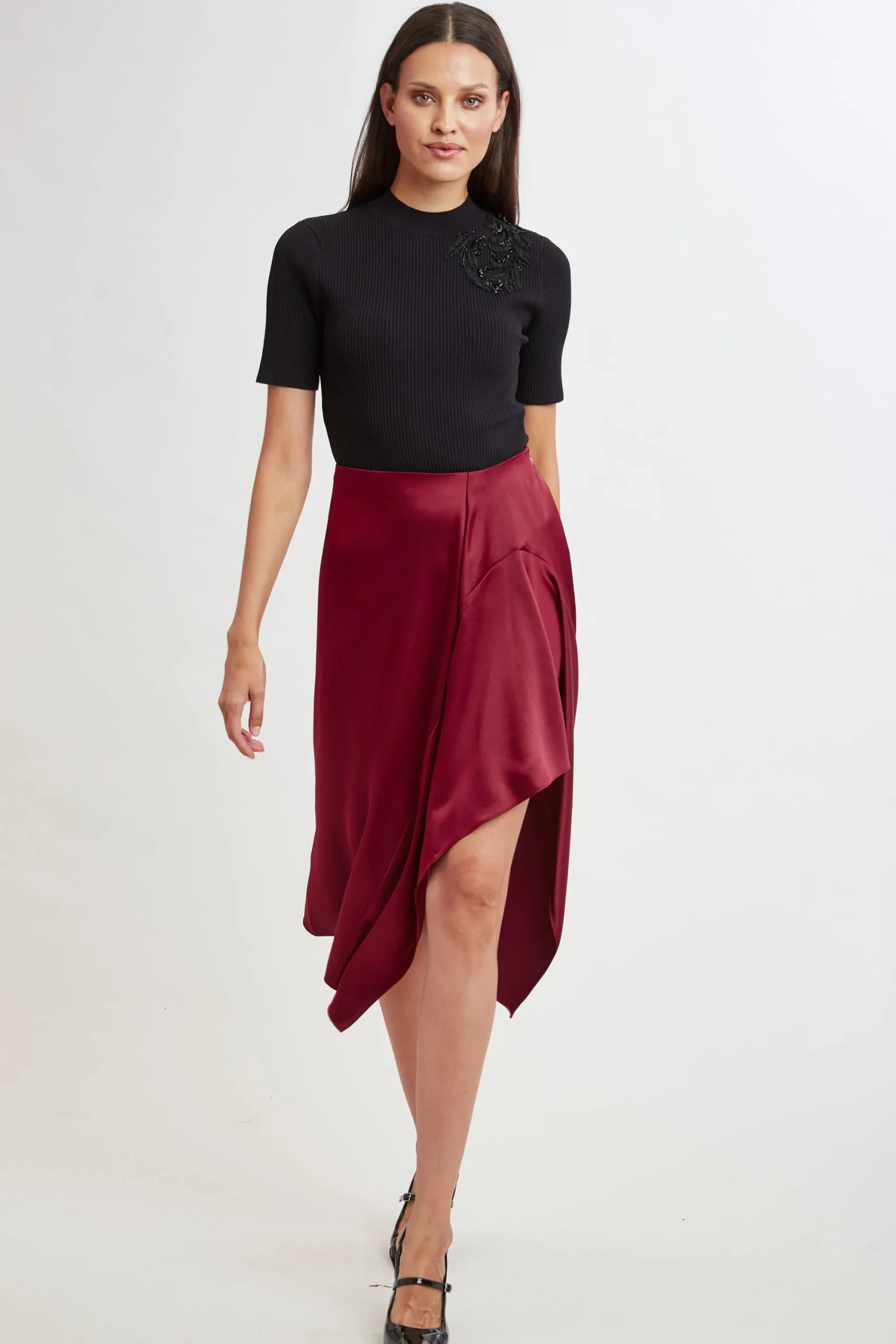Be the first to review “Elie Tahari Bottoms-Asymmetric Hem Satin Midi Skirt” Cancel reply