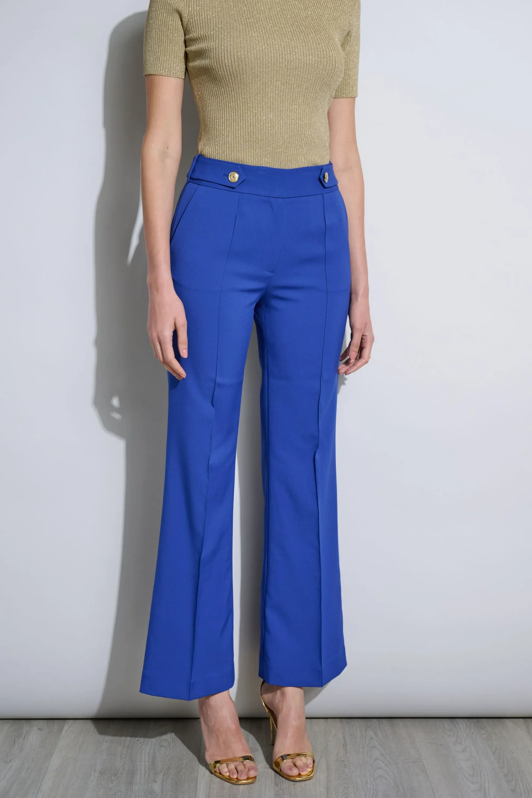 Our fit u0026amp; flare pants have a modern twist with graphic crest buttons at the waist. In our iconic crepe, these pants feature pintuck detailing u0026amp; side pockets – perfect for work or dinner. Crepe Crest Button Fit u0026amp; Flare PinTuck Pant 88% Polyester, 12% Elastane Runs true to size. Model is 5’9″ and wearing size 2 Measurements: Inseam 31.5″L, Front Rise 11.75″L (approx. length for size 6) Machine Wash Imported Style #: ETR34123