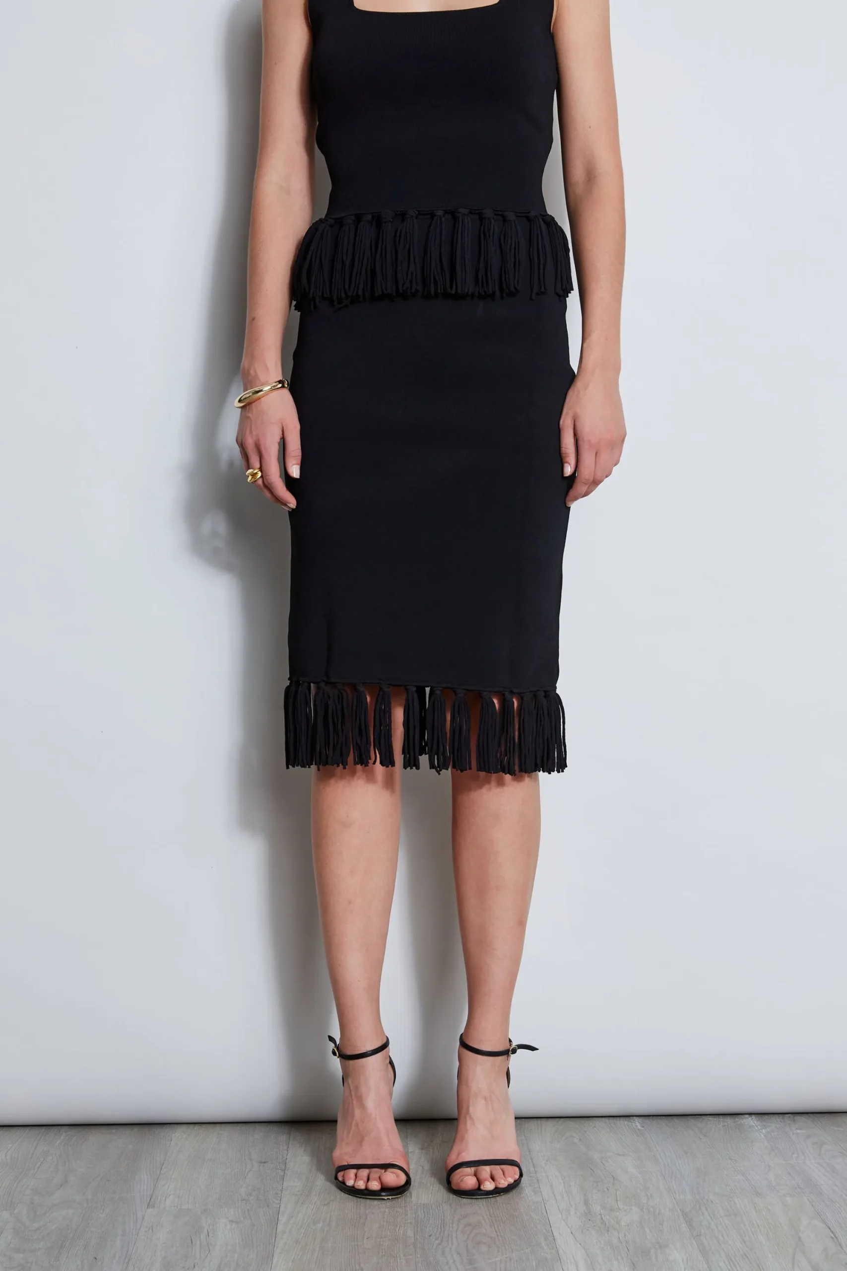 Versatile and undeniably chic, our knit skirt has the cool factor you are looking for. Figure skimming, comfortable u0026amp; decidedly cool, its chic minimalist design features an edgy fringe hem -perfect for day to dinner. Wear it as a separate or with its matching Fringe Hem Sweater. Knee Length Knit Sweater with Fringe Hem 64% Viscose, 22% Nylon, 14% Polyester Runs True to Size Model is 5’9″ and wearing size S Imported Dry clean only Style #: ETR41350
