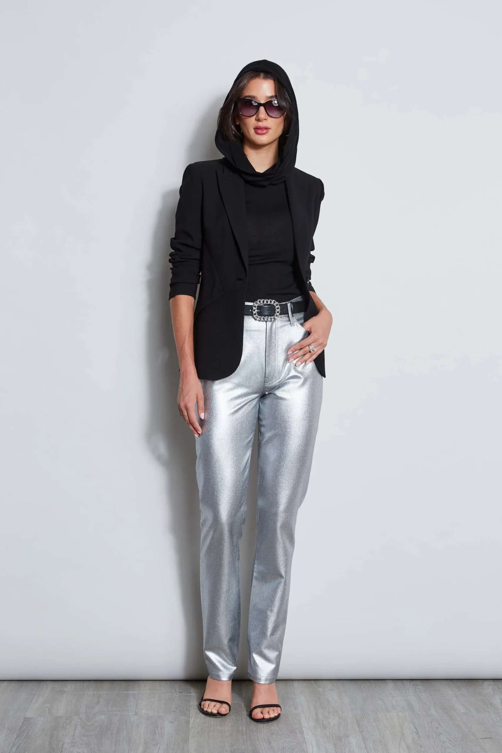 These will be the glam pants you can’t get out of your head. Soft to the touch, you will fall in love with our Metallic Stretch Twill Pant. The jean styling u0026amp; modern straight leg cut give it a cool vibe perfect for pairing with our luxe cashmere sweaters or crepe blazers. Elie Tahari Exclusive Silver Metallic Stretch Twill Pant 76% Polyester, 18% Viscose, 3% Elastane, 3% Polyurethane Runs true to size. Model is 5’9″ and wearing size 2. Measurements: 11.5″L Front Rise, 32.5″L Inseam (approx. length for a size 6) Dry Clean Only Imported Style #: E804R204