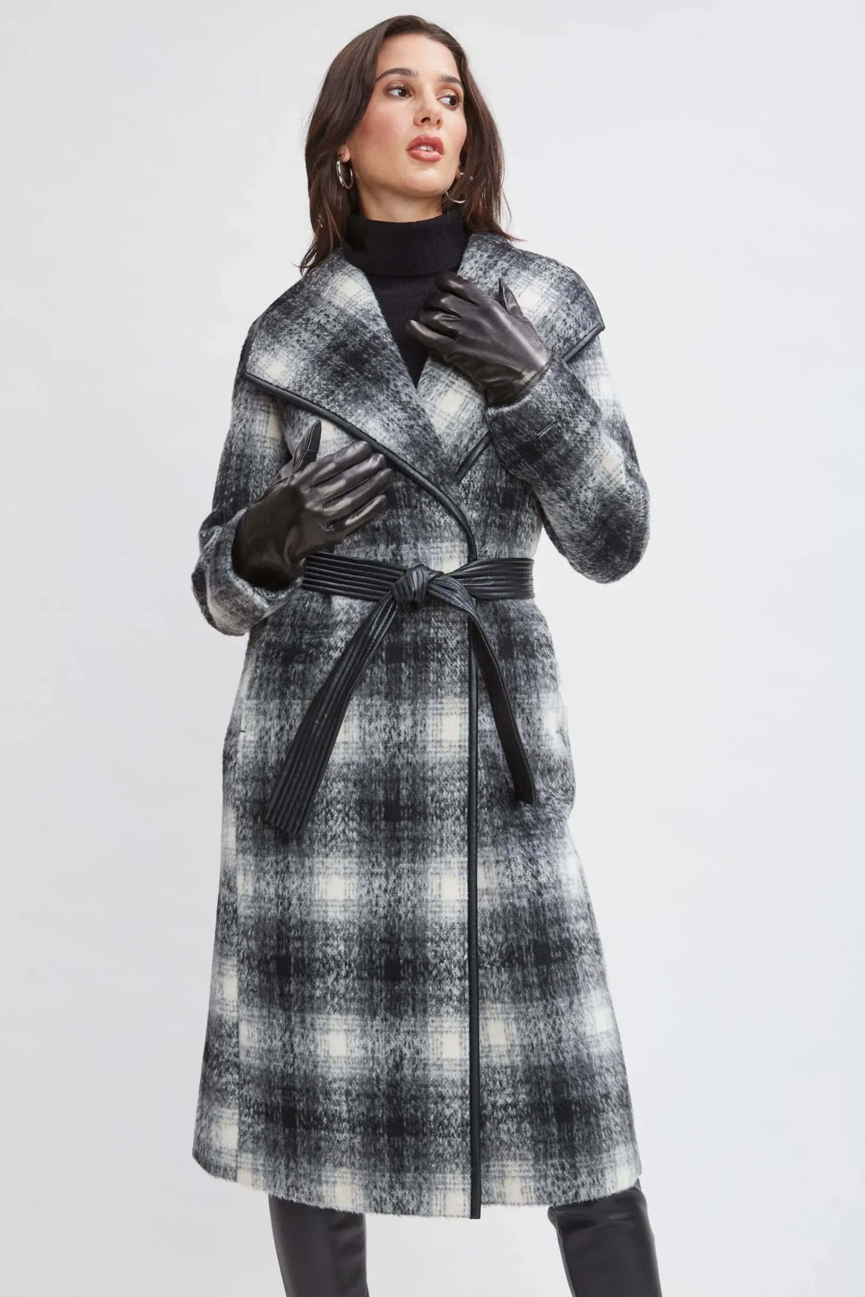 Make a statement with Fall ‘s plaid trend in our Tahari Wool Plaid Wrap Coat. Featuring a Lush wing lapel, vegan leather trim and a modern wrap closure with a self-sash, the graphic plaid lends a fashion vibe to your cold weather look. Mid-Length Plaid Wrap Coat with Vegan Leather Trim Runs true to Size Model is 5 ‘9″ and wearing size S Dry Clean Only Imported Style #: 6621534