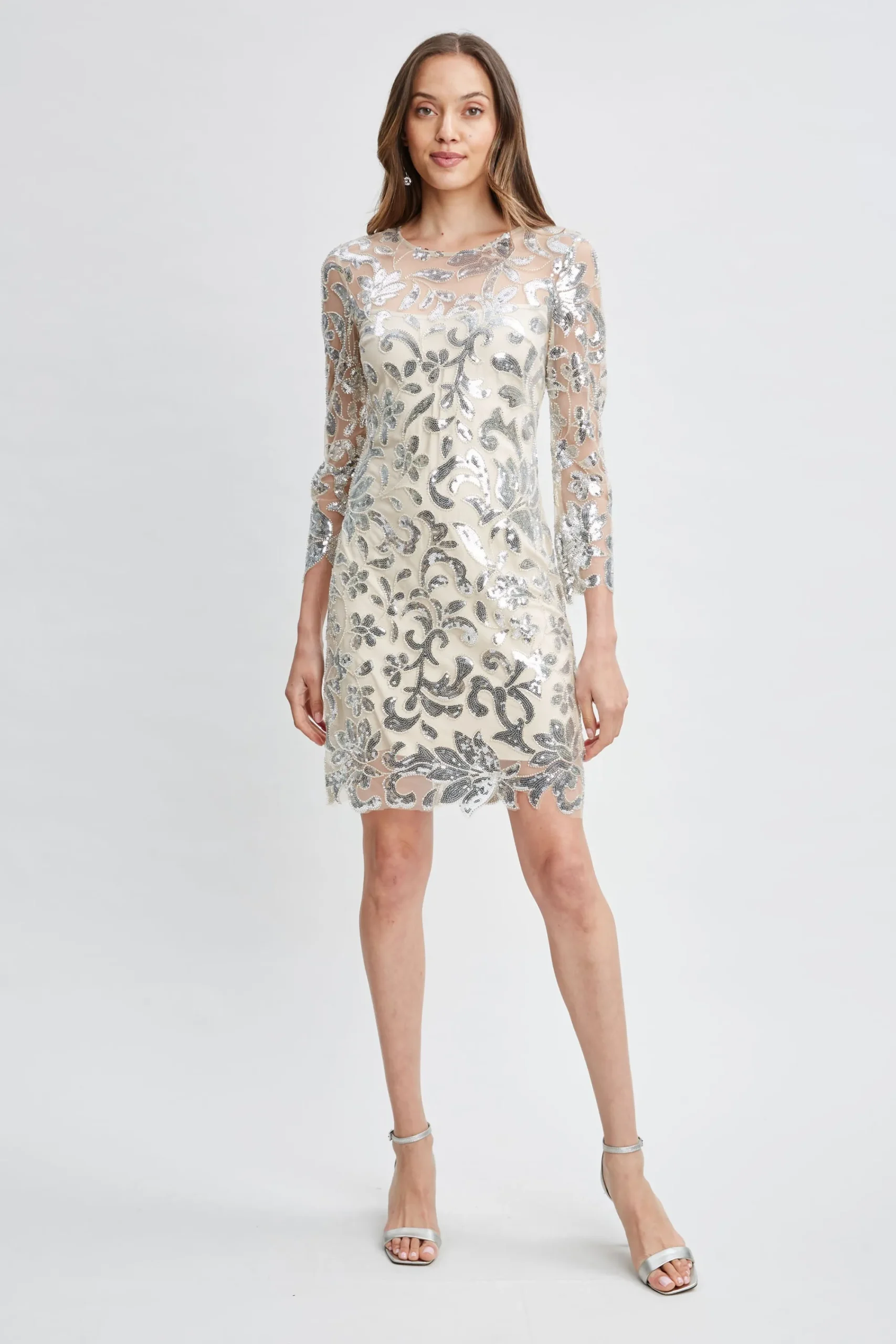 Strike a pose! All eyes will be on you the minute you walk into the room. This party perfect dress is designed in a unique sequin floral mesh fabric that is partially lined to accent the unique embroidery. The scallop hem and bracelet length sleeves are hand cut to follow the floral motif. Elie Tahari Exclusive Long Sleeve Floral Sequin Cocktail Dress 50% Nylon, 50% Polyester Runs true to size. Model is 5’9″ and wearing size 4 Length From Shoulder to Hem: Back 36.5″L, Sleeve 21.25″L (approx. length for size 6) Dry Clean Only Imported Style #: ER073604