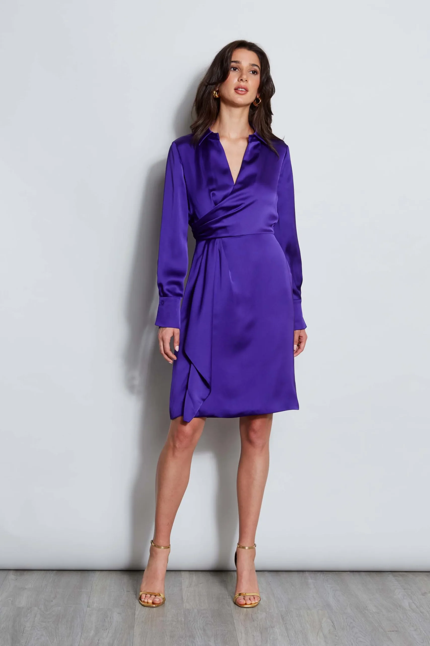 Our Mock Wrap Satin Dress has a modern femme vibe that will work overtime in your closet. With a shirt collar and flattering wrap bodice, this dress adds new expression to Fall’s shirtdress trend. Elie Tahari Exclusive Long Sleeve Crepe Dress with Side Tie Twist, Shirt Collar u0026amp; Asymmetric Button Bodice 100% Polyester Runs true to size. Model is 5’9″ and wearing size 2 Measurements: Back 39″L, Sleeve 32.5 “L (approx. length for size 6) Dry Clean Only Imported Style #: E802G604