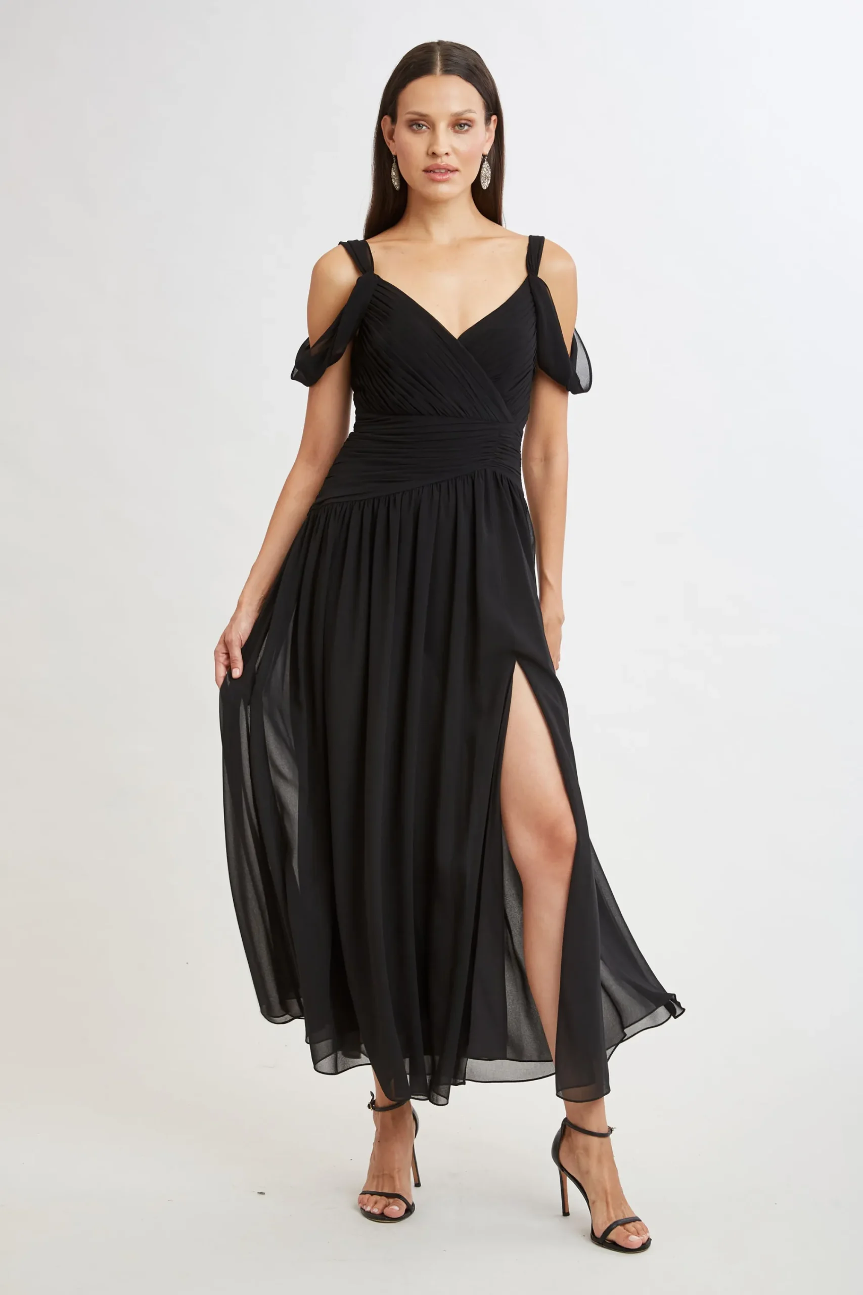 Step into elegance with our Georgette Gown. Designed with delicate pleat detailing on the bodice and waist and draped cold shoulder straps, and a fluid slitted skirt, this gown flows effortlessly with each step. Limited Edition 50th Anniversary Collection Elie Tahari Exclusive Chiffon Cold Shoulder Gown with Side Slit 100% Polyester Runs true to Size Length From Shoulder to Hem: Back 47.75″L, Sleeve Drape 19.5″L (approx. length for size 6) Model is 5’9″ and wearing size 2 Dry Clean Only Imported Style #: E9062604