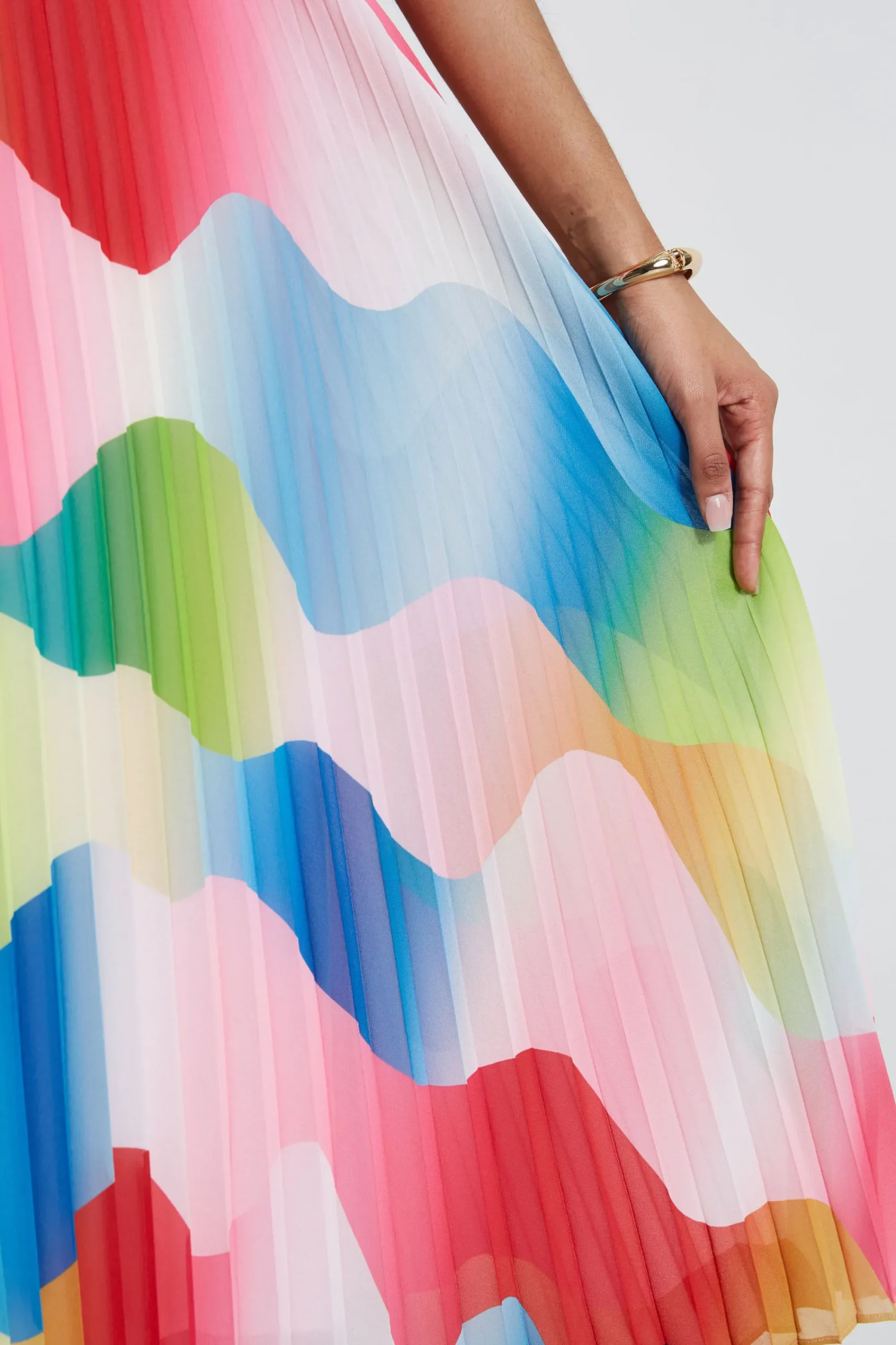 Our playful Pleated Midi Dress has a playful vibe. The halter neckline u0026amp; viscose knit bodice combines with a graphic georgette print pleated skirt to create a standout dress. Definitely poetry in motion! Viscose Halter Bodice Knit Dress with Printed Pleated Midi Skirt 49% Polyester, 33% Viscose, 16% Nylon, 2% Spandex Runs true to size. Model is 5’9″ and wearing size S Imported Style #: ETR41345