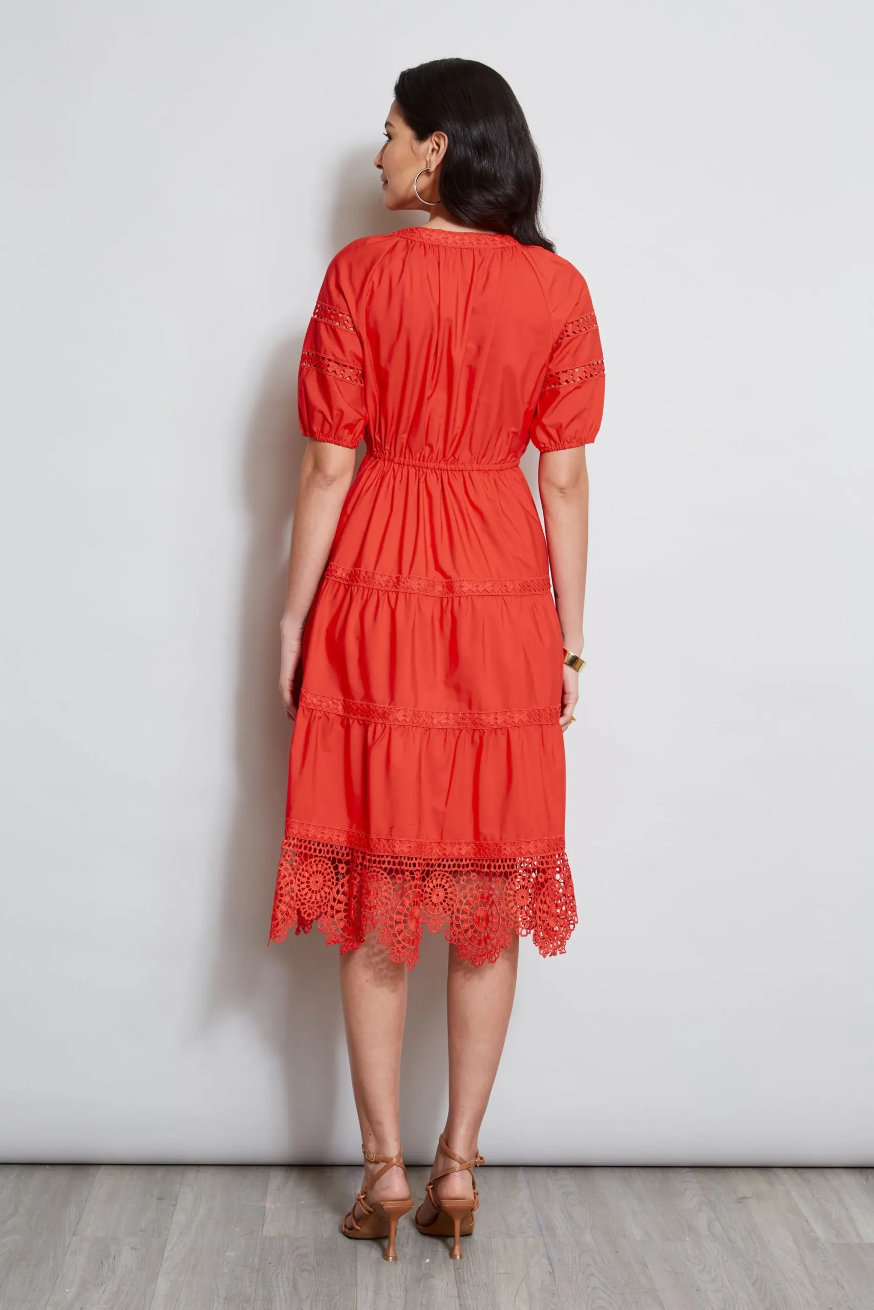 Elie’s favorite stretch Cotton Blend has the Luxe Patina and comfort he wanted for the seasons must have shirtdress. The unique cut-out embroidery at the hem u0026amp; sleeve, soft full skirt and tassel time at the waist speak designer. Cotton Blend Short embroidered sleeve Tie Front Dress 65% Polyester, 35% Cotton Runs true to size. Model is 5’10” and wearing size Small Length From Shoulder to Hem: Back 48 (approx. length for size S) Dry Clean Only Imported Style #: ETR32165