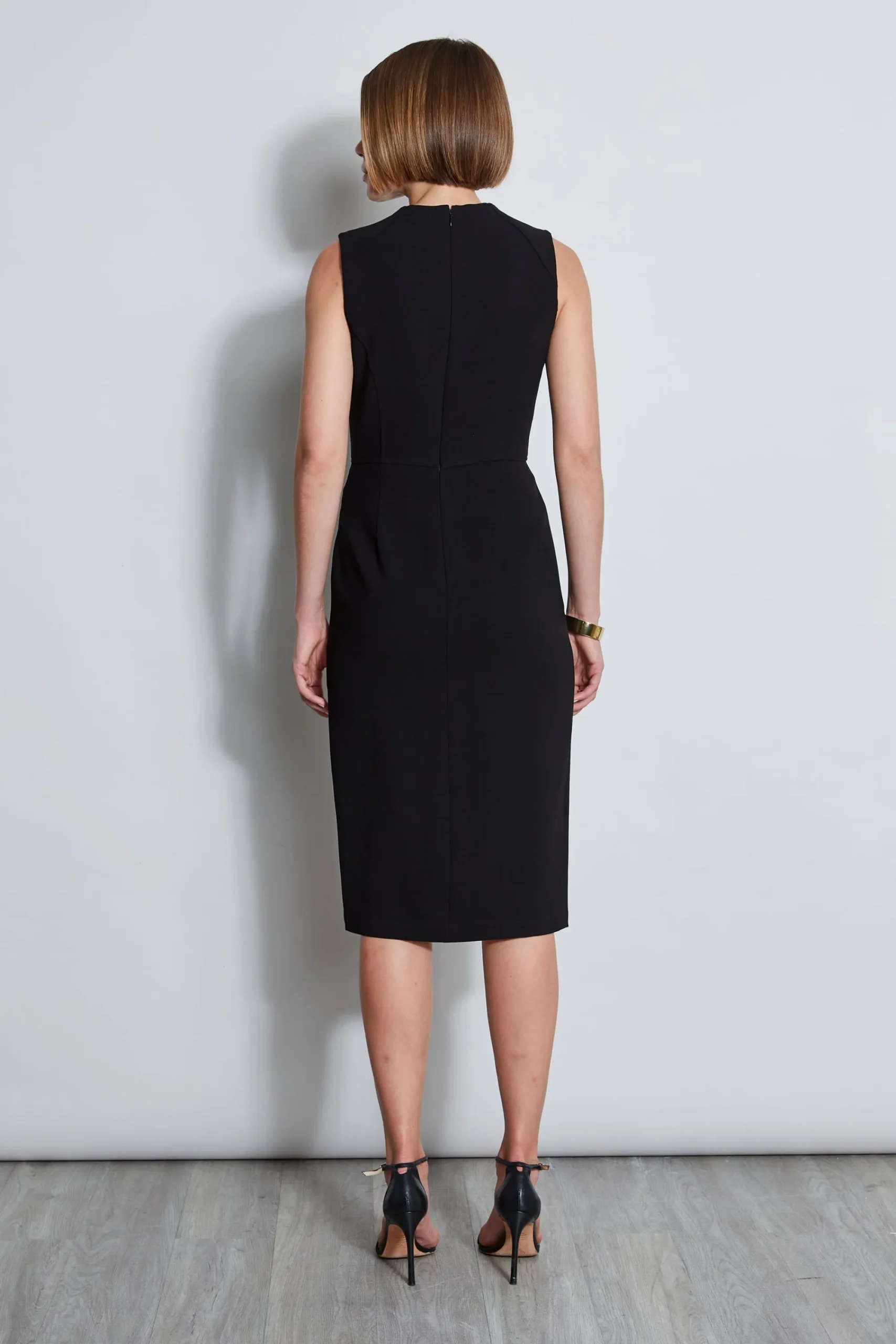 Go all in on chic with our Dart Neck Dress. Figure skimming u0026amp; decidedly cool, its minimalist design with its sculpted dart neckline features side pleats that accentuate your figure. Designed in our signature Fluid Crepe, you will love the look u0026amp; feel of this standout dress. Elie Tahari Exclusive Fitted Bodycon Fluid Crepe Dress with Neck Dart Detailing 70% Triacetate, 30% Polyester Runs true to size. Length From Shoulder to Hem: Back 43.1″L (approx. length for size 6) Model is 5’9″ and wearing size 2 Dry Clean Only Imported Style #: E7087604