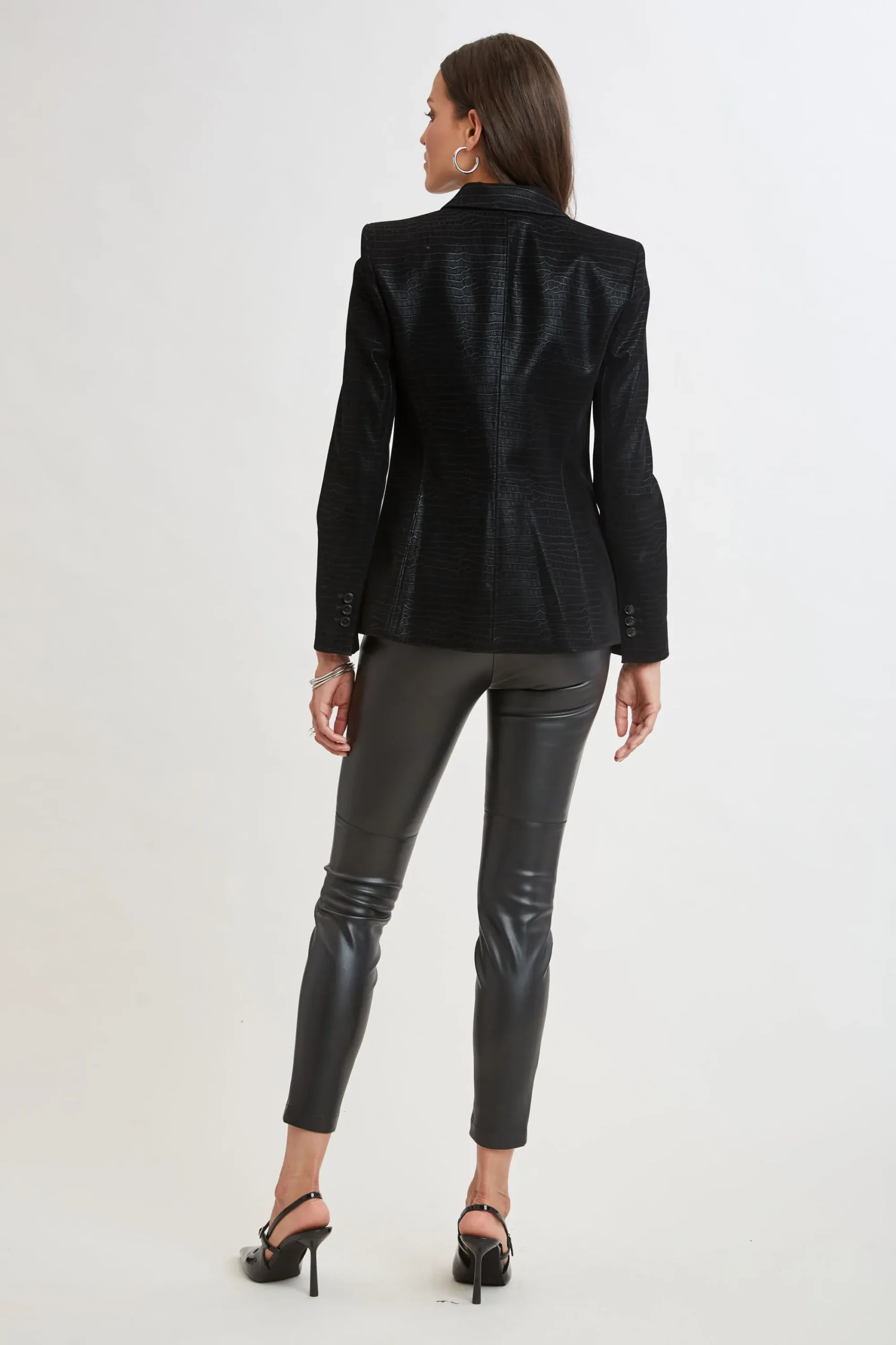 Crafted from sueded Crocodile-Embossed Vegan Leather, our single-breasted blazer exudes designer attitude with its distinctive patina and side panel inserts. Meticulously tailored for a sophisticated, elevated look. Pair it with its matching skirt for a chic head-to-toe outfit. Limited Edition 50th Anniversary Collection Elie Tahari Exclusive Crocodile Embossed Vegan Leather Single Button Panel Blazer 62% Polyurethane, 33% Viscose, 5% Other Runs Small, Size Up Length From Shoulder to Hem: Back 26″L, Sleeve 33″L (approx. length for size 6) Model is 5’9″ and wearing size 2 Dry Clean Only Imported Style #: E903W114