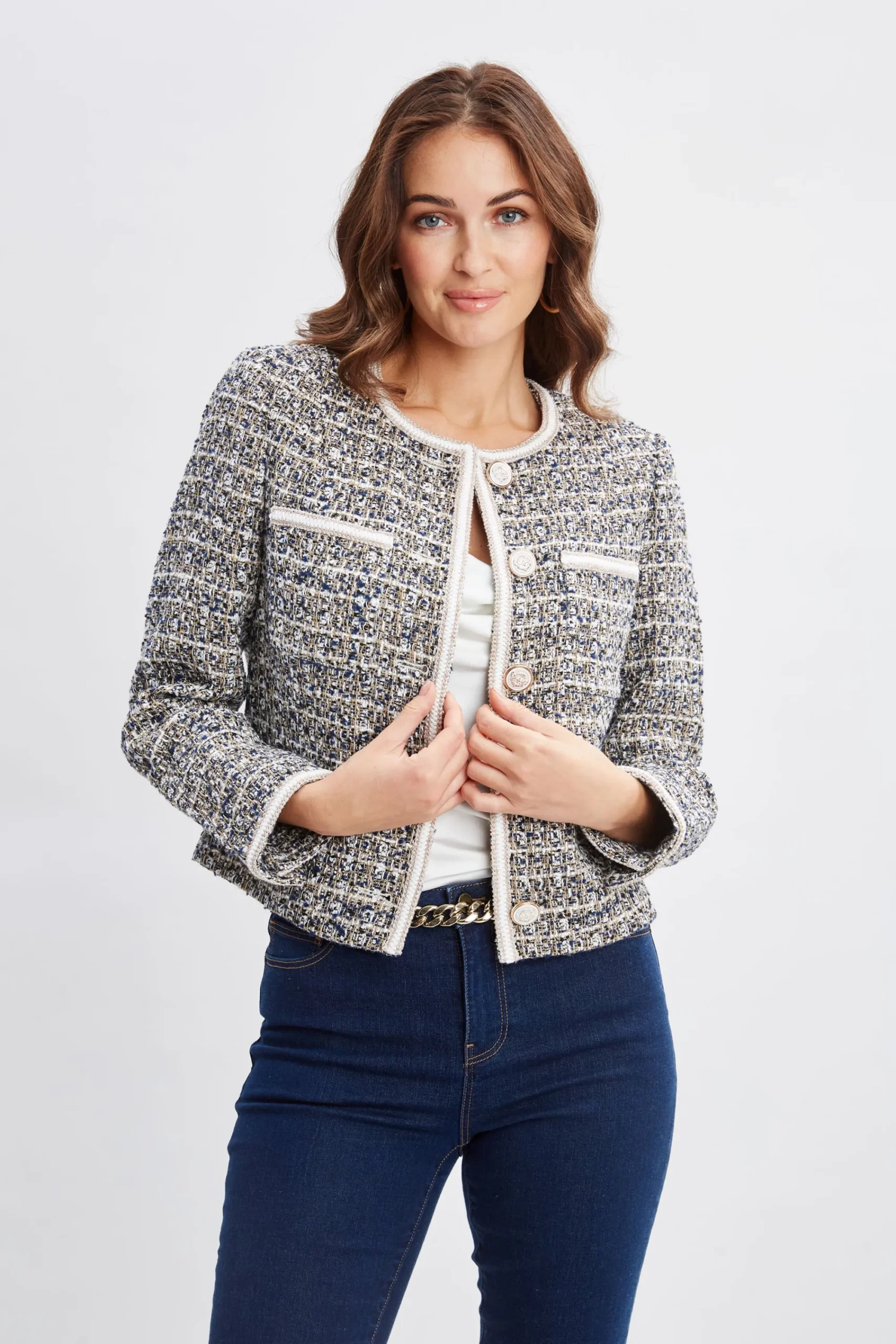 Our novelty tweed jacket has a modern cardigan vibe with its jewel neckline, crest button and contrasting trim. Rich in texture, it’s perfect for pairing with a column of black or white. Cropped Tweed Jacket with Crest Buttons Runs True to Size Model is 5’9″ and wearing size 2 99% Polyester, 1% Other Fiber Dry Clean Only Imported Style #: ETR45276