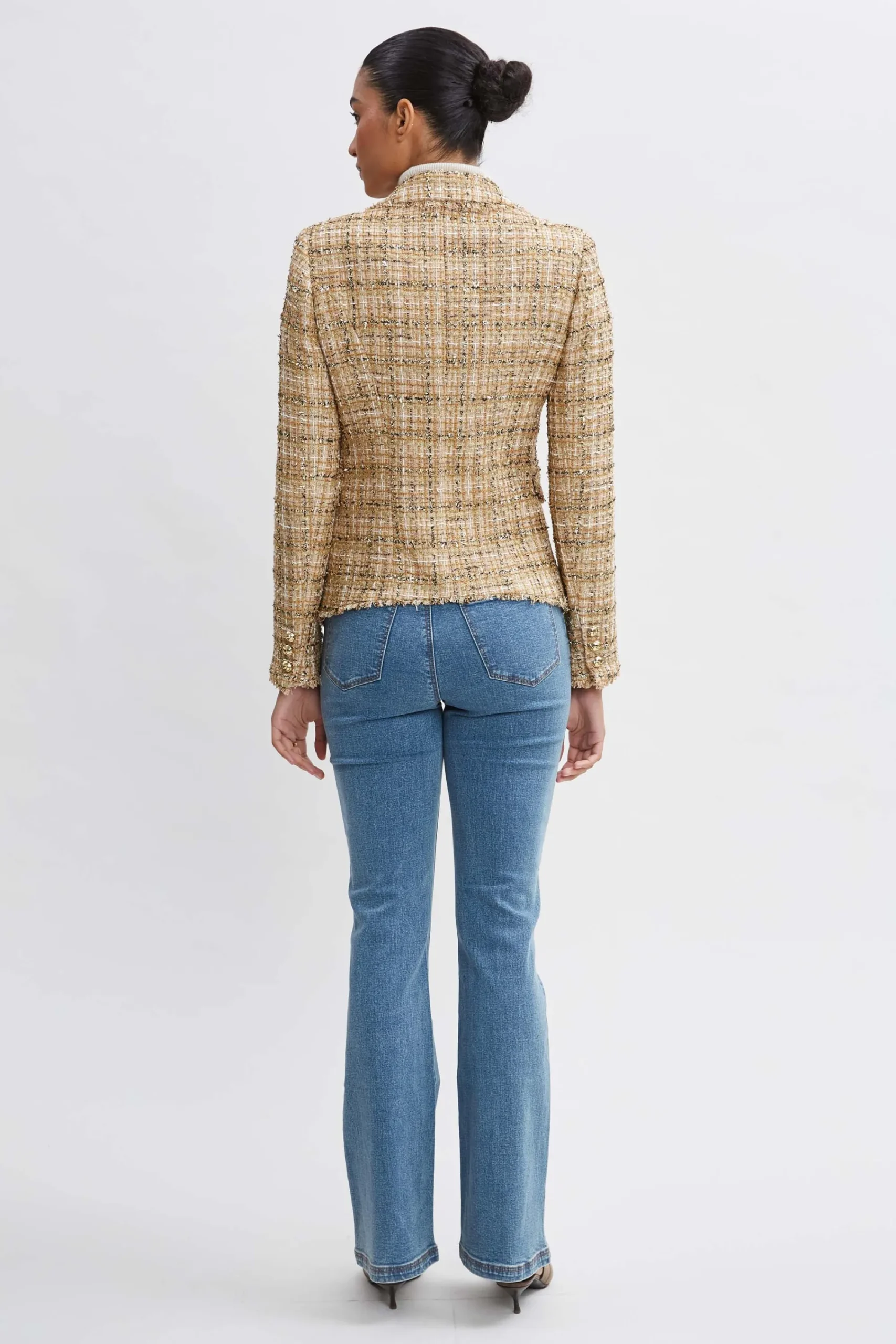 Elie chose a sophisticated Italian metallic tweed for his signature blazer. Single breasted with peaked lapels, the impeccable fit lends a body skimming silhouette. Detailed with fringe u0026amp; gold crest buttons, it has the designer vibe you are looking for. Elie Tahari Exclusive Metallic Tweed Blazer 49% Cotton, 27% Acrylic, 10% Polyester, 7% Poly Metallic, 4% Poly Amid, 3% Other Fiber Runs true to size. Model is 5’9″ and wearing size 2 Length From Shoulder to Hem: Back 22″L, Sleeve 25.25″L (approx. length for size 6) Dry Clean Only Imported Style #: E904C104