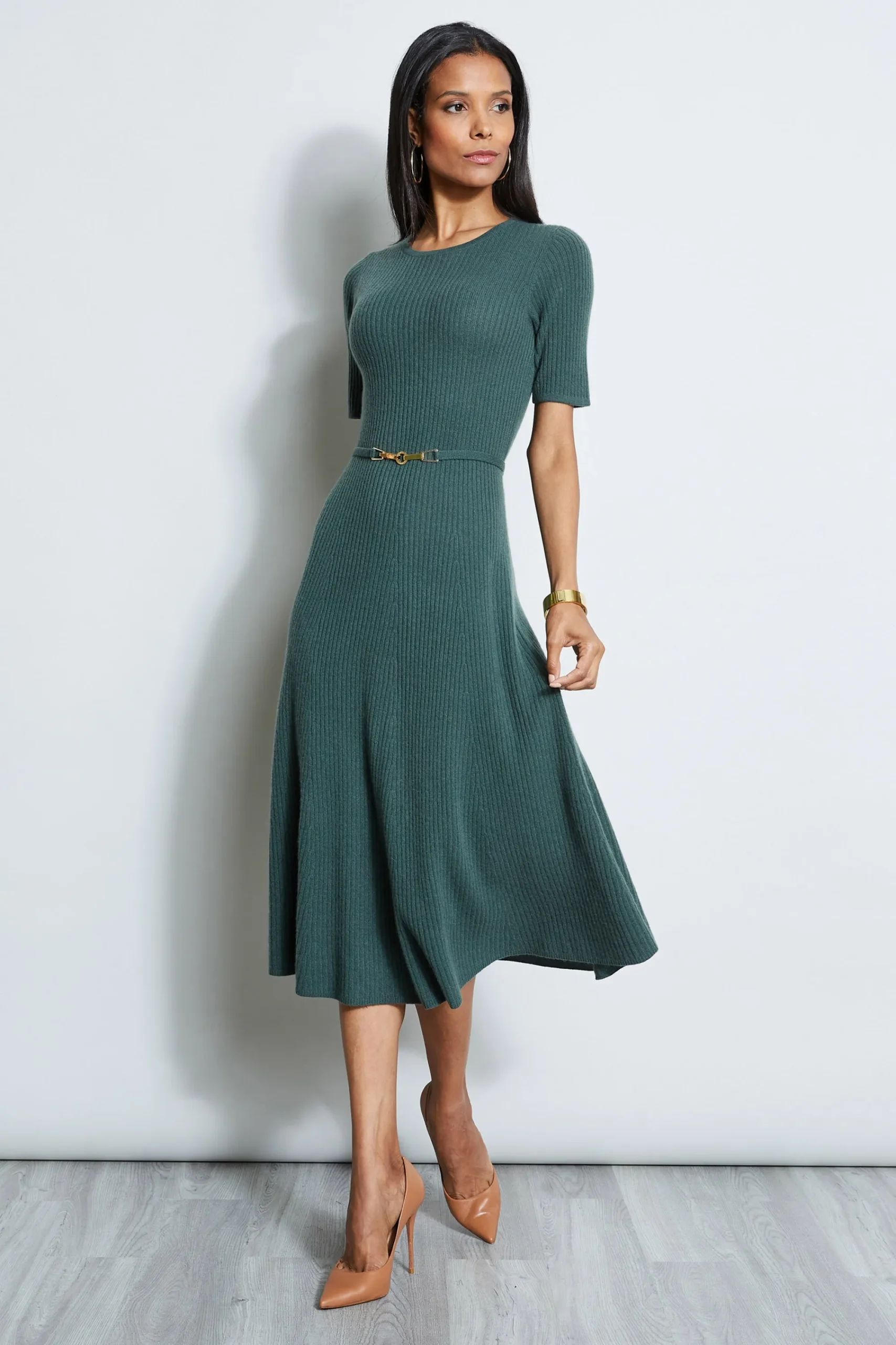 Immerse yourself in the essence of refined luxury with our soft touch Rib Cashmere Knit Dress. This midi dress features an easy A-line silhouette, short sleeves u0026amp; self-belt that is adorned with a gold buckle. Ultra-Soft u0026amp; understated, this dress defines quiet luxury and can be worn with pumps or the seasons knee grazing boots. Short Sleeve Cashmere Midi Dress with Self Belt u0026amp; gold buckle 100% Cashmere Runs true to size Model is 5’9″ and wearing size S Dry Clean Only Imported Style #:¬†ETR22548