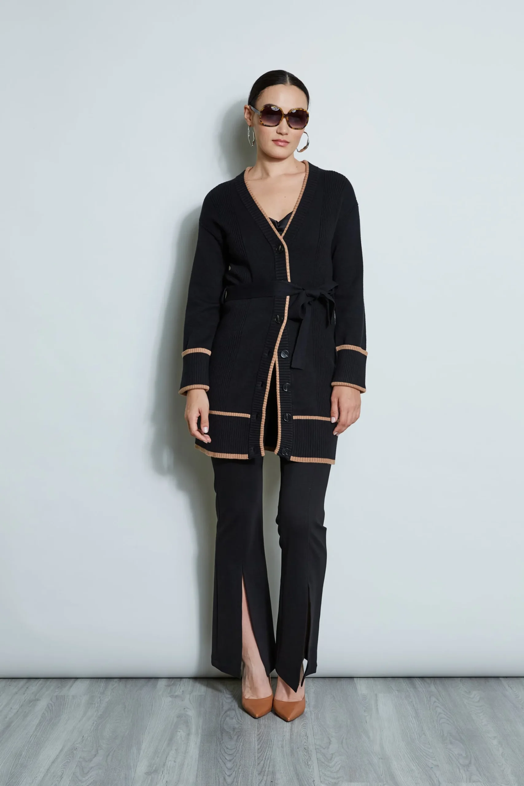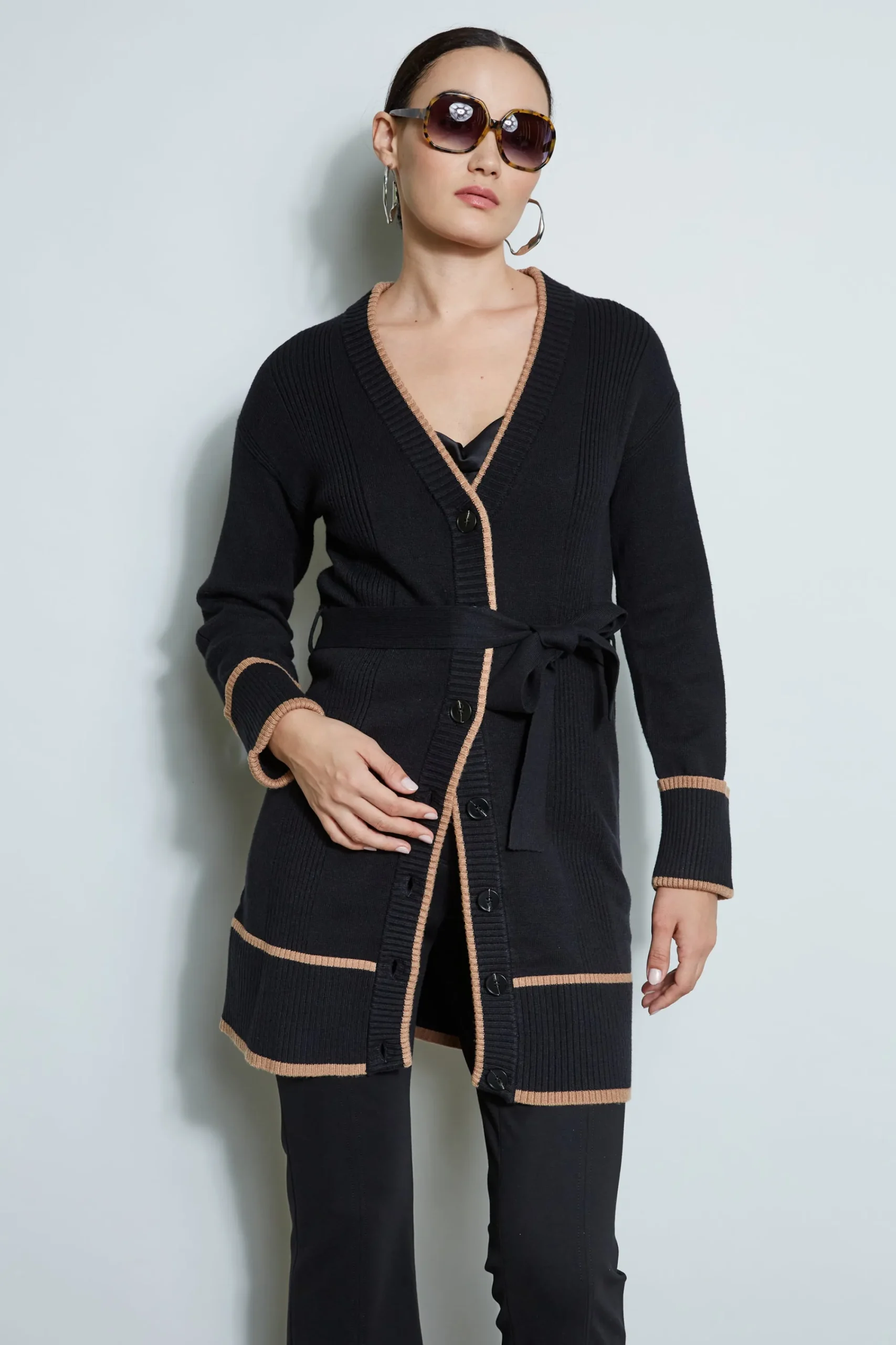 The contrasting trim of our soft touch cardigan makes this sweater a must have layering piece. With a front button closure u0026amp; a self-sash, it will become your favorite go-to. Contrast Trim Button Up Cardigan Sweater Hits Below Hips, Runs true to Size Model is 5 ‘9 ” and wearing size S Dry Clean Only Imported Style #: ETR34172