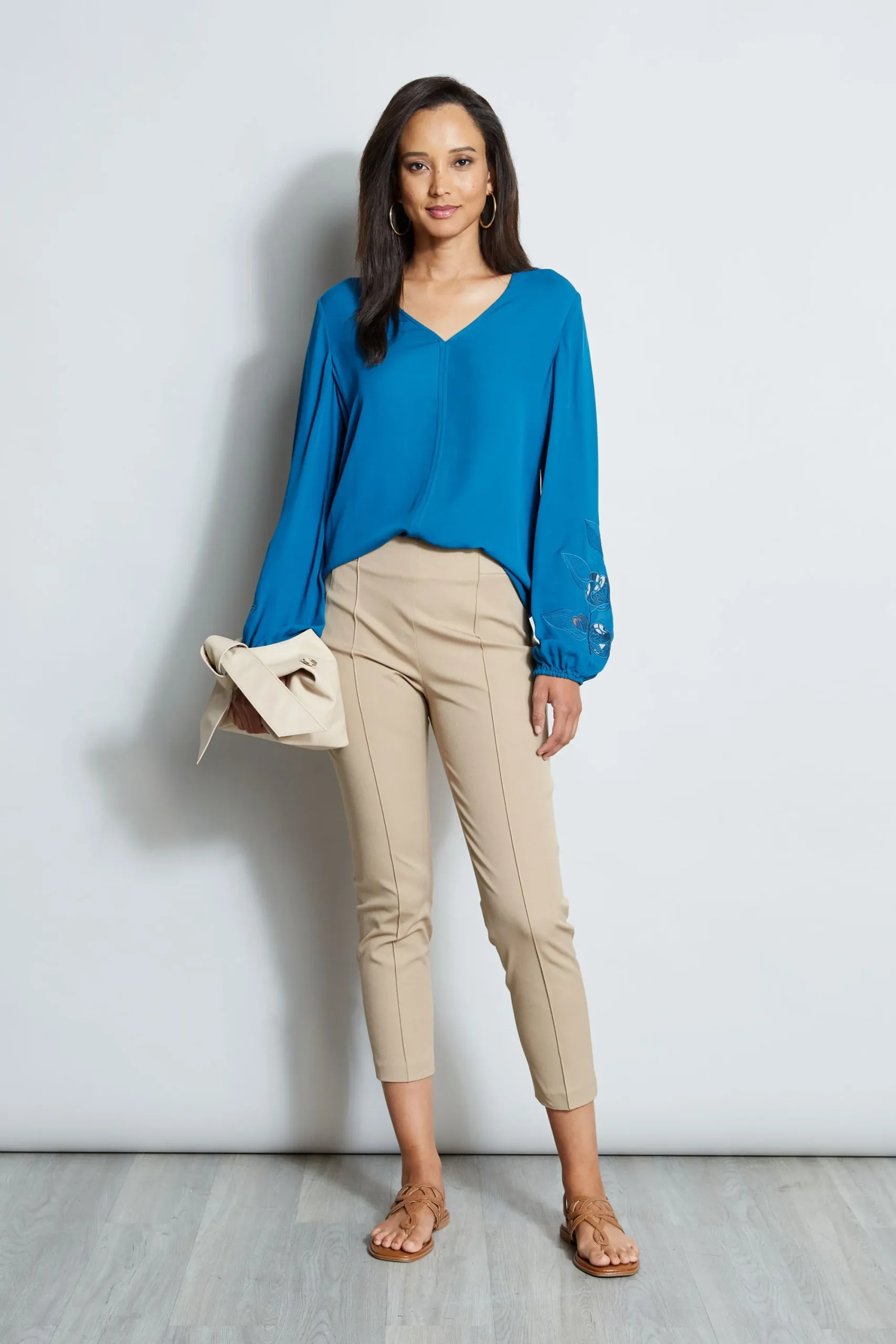 Romantic floral embroidery details the sleeves of our V-neck shirt in Luxe Silk Georgette. We ‘re obsessed with the details u0026amp; cool factor of this all-season shirt. Elie Tahari Exclusive Silk V-Neck Embroidered Long Sleeve Shirt 100% Silk Runs true to Size Model is 5’9″ and wearing size S Length From Shoulder to Hem: Back 24.5″L, Sleeve 25″L (approx. length for size S) Dry Clean Only Imported Style #: E710N503