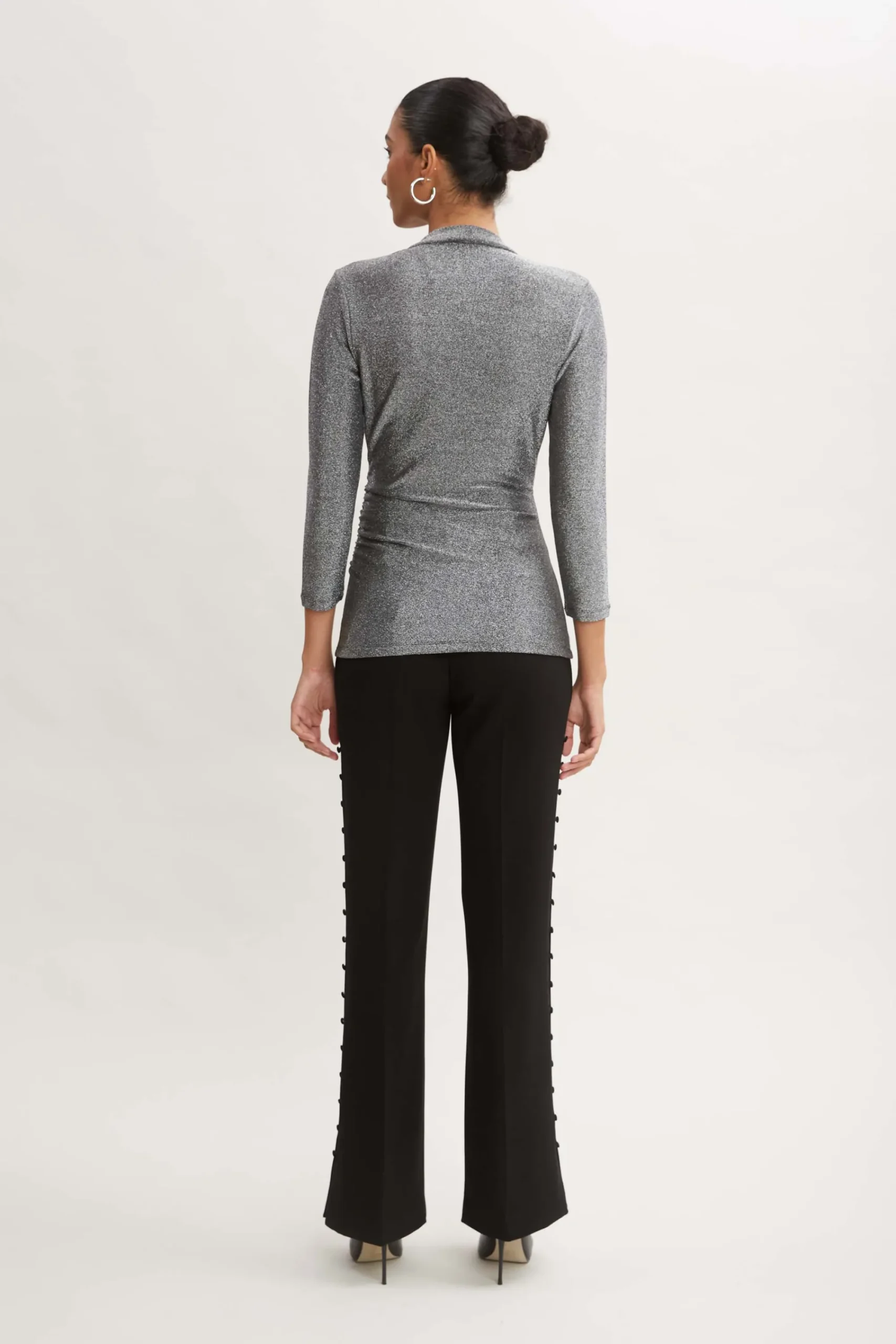 A knit with a cool vibe, nothing beats the chic factor and luxe patina of our metallic knit. Our modern Mock Wrap Metallic Knit has flattering side ruch detailing that gives it a flattering body skimming silhouette. This metallic knit will add style and function to your wardrobe. Elie Tahari Exclusive Metallic Ruched Knit 75% Polyamide, 20% Polyester, 5% Elastane Runs true to Size Length From Shoulder to Hem: Back 26″L, Sleeve: 32.5″L (approx. length for size S) Model is 5’9″ and wearing size XS Dry Clean Only Imported Style #: E956A504