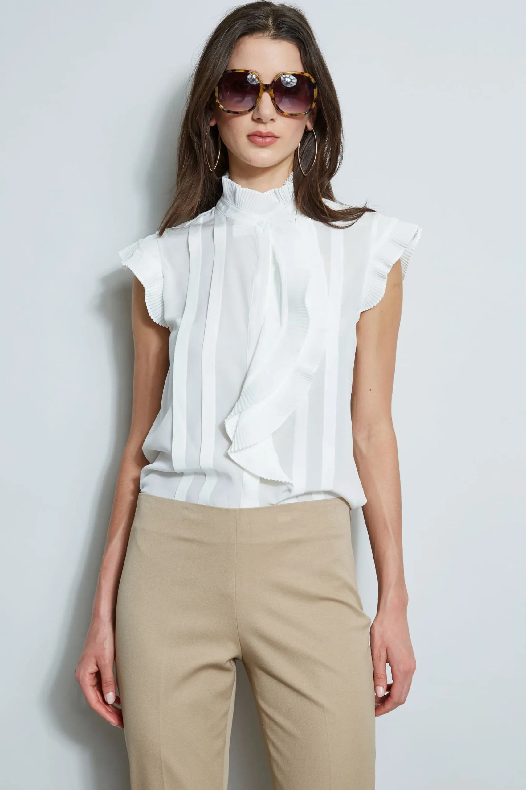 Every Spring wardrobe needs a chic Silk top. Upgrade yours with a charming cascade pleated ruffle effect in luxe silk georgette. Detailed with rows of delicate pin tucks, it adds the right touch of femininity. Pleated Flutter Sleeve Button Down Silk Shirt 100% Silk Runs true to size. Model is 5’9″ and wearing size S Length From Shoulder to Hem: Front 25″L(approx. length for size s) Dry Clean Only Imported Style #: ETR31195