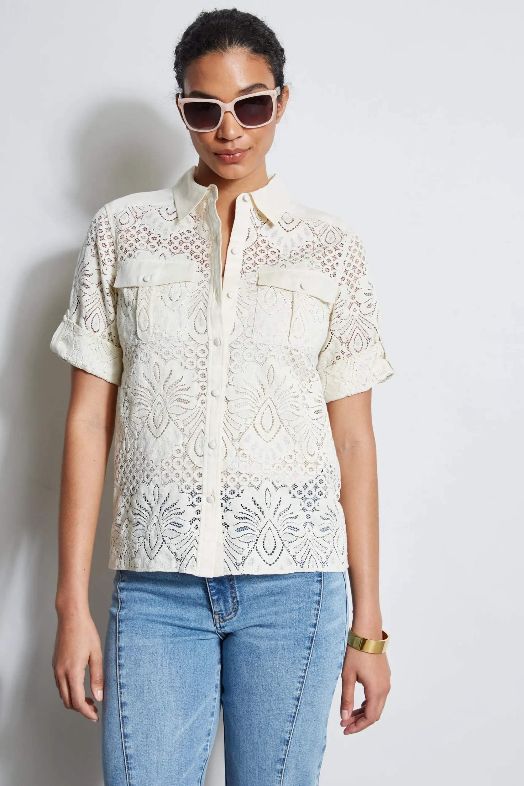 In modern lace, this shirt has a cool vibe. The linen covered button front closure, utility patch pockets u0026amp; open-work lace make it perfect for warm Spring days. Versatile u0026amp; chic, wear it with Elie’s favorite white or denim jeans, or dressed up with our crepe pants. Elie Tahari Exclusive Short Sleeve Lace Button Down Shirt with Utility Chest Pockets 49% Polyamide, 47% Cotton, 4% Elastane Runs true to size. Model is 5’9″ and wearing size S Length From Shoulder to Hem: Back 25.5 “L, Sleeve: 21 “L (approx. length for size S) Dry clean Imported Style #: E403H504