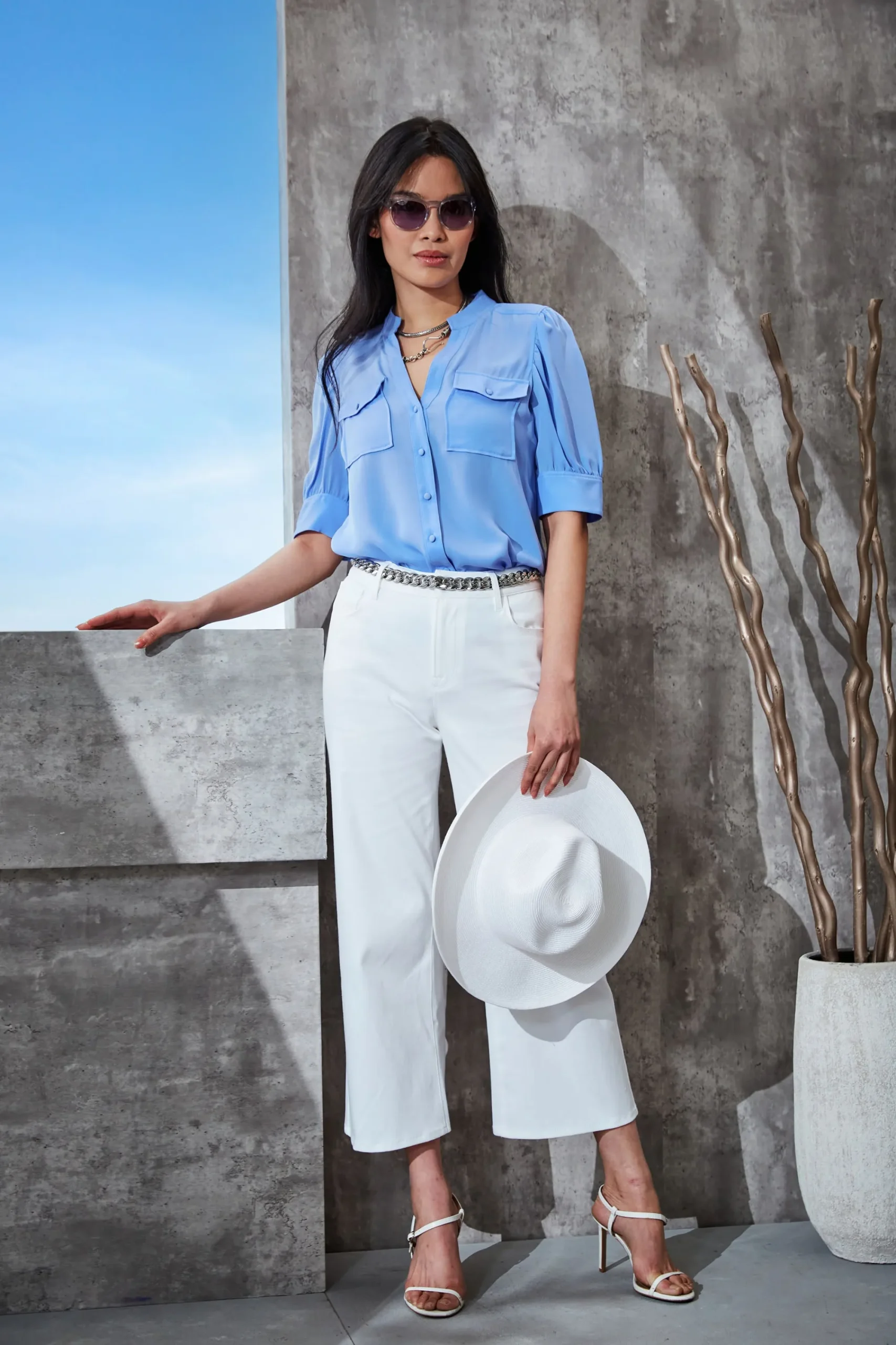 Meet Spring’s must have shirt. Styled in Silk Georgette, this sporty chic shirt is accented with self-covered buttons u0026amp; utility pockets. Designed with a band collar u0026amp; short ruched sleeves, you will love the look of this essential top. Dress it up or down with denim. Elie Tahari Exclusive Puff Ruched Short Sleeve Silk Georgette Top with Chest Utility Pockets u0026amp; Self Covered Buttons 100% Silk Runs true to size. Model is 5’9″ and wearing size S Length From Shoulder to Hem: Back 24.5″L, Sleeve: 13 “L (approx. length for size S) Dry Clean Only Imported Style #: E410N514
