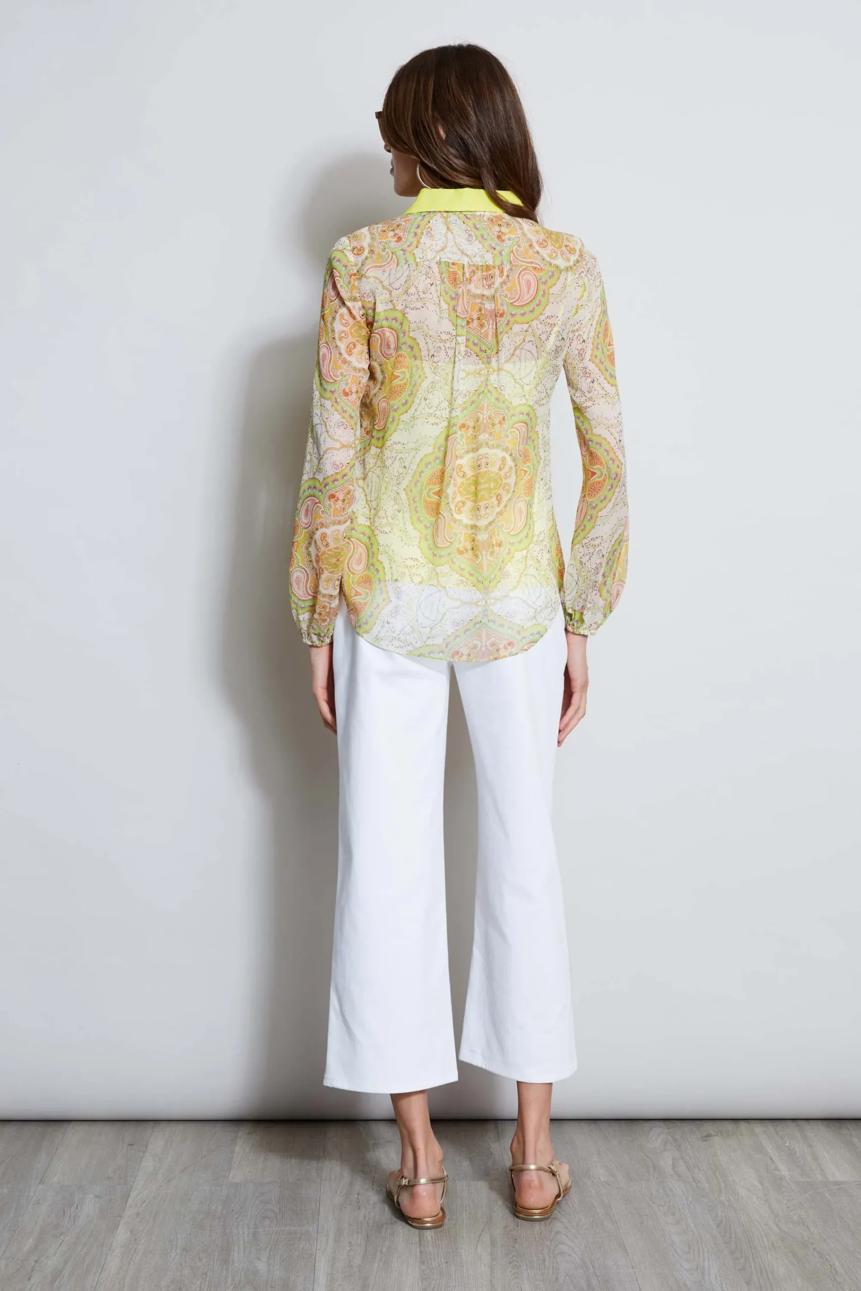 Express yourself in our Mosaic Tile Print Shirt. Designed in Silk Crinkle Chiffon, its sophisticated and playful mix of color and design can be dressed up or down with jeans. Bold and chic, this shirt has the wow factor. It comes with a separate layering cami. Elie Tahari Exclusive Mosaic Tile Print Silk Crinkle Chiffon Button Down Shirt 100% Silk Crinkle Chiffon Runs true to size. Model is 5’9″ and wearing size S Length From Shoulder to Hem: Back 26.75″L, Sleeve 33.12″L (approx. length for size S) Dry Clean Only Imported Style #: E504J504