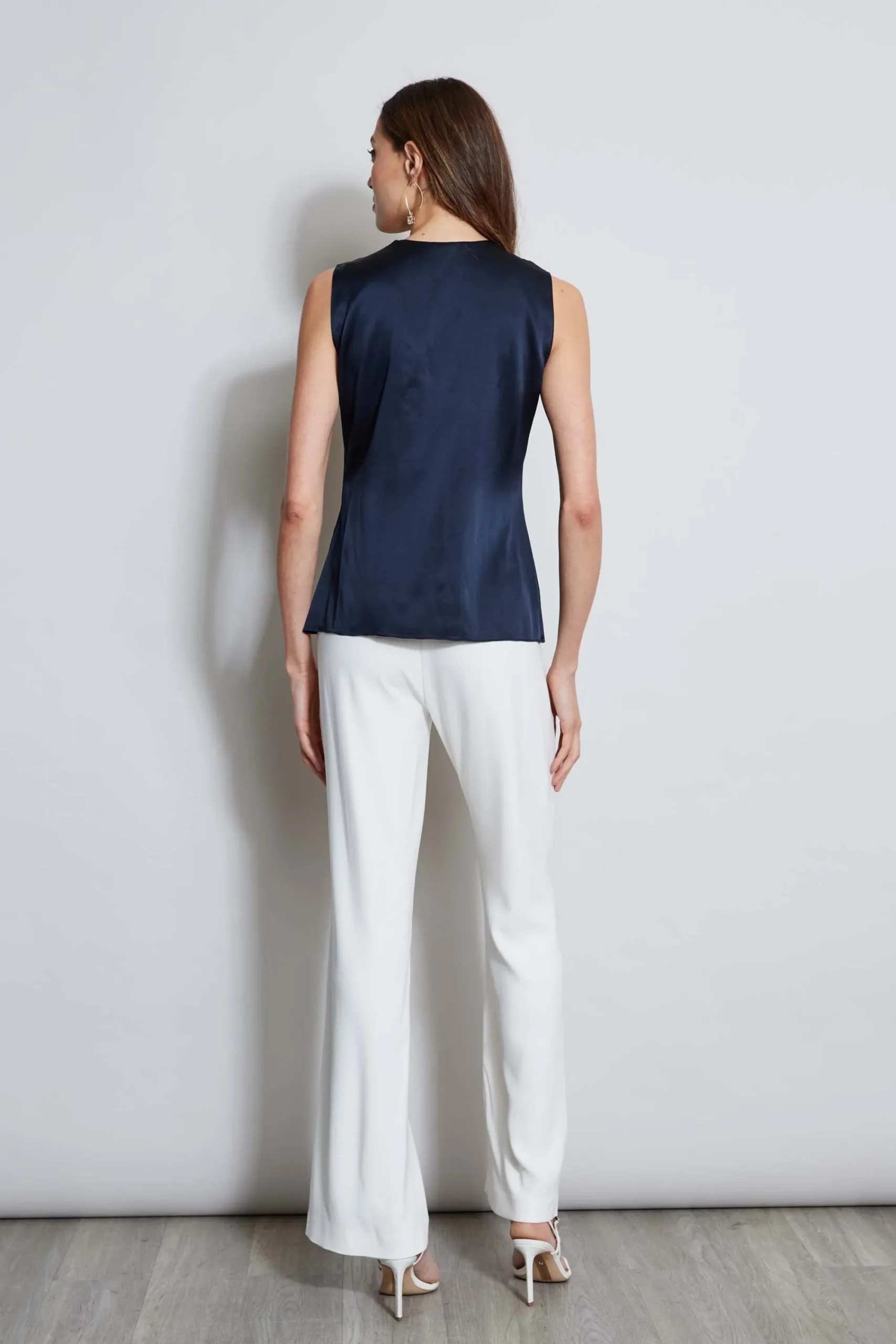 It’s all in the details! All eyes are on the modern contour neckline u0026amp; cascading ruffle of our Stretch Silk Satin Shirt. Dress it up with heels u0026amp; our Overlay Pant or down with our denim for a fresh take on a must-have. Elie Tahari Exclusive Sleeveless Stretch Silk Satin Shirt with Cascading Ruffles u0026amp; Contour Neckline 93% Silk, 7% Elastane Runs true to size. Model is 5’9″ and wearing size S Length From Shoulder to Hem: Back 23.5″L (approx. length for size S) Dry Clean Only Imported Style #: E5053504