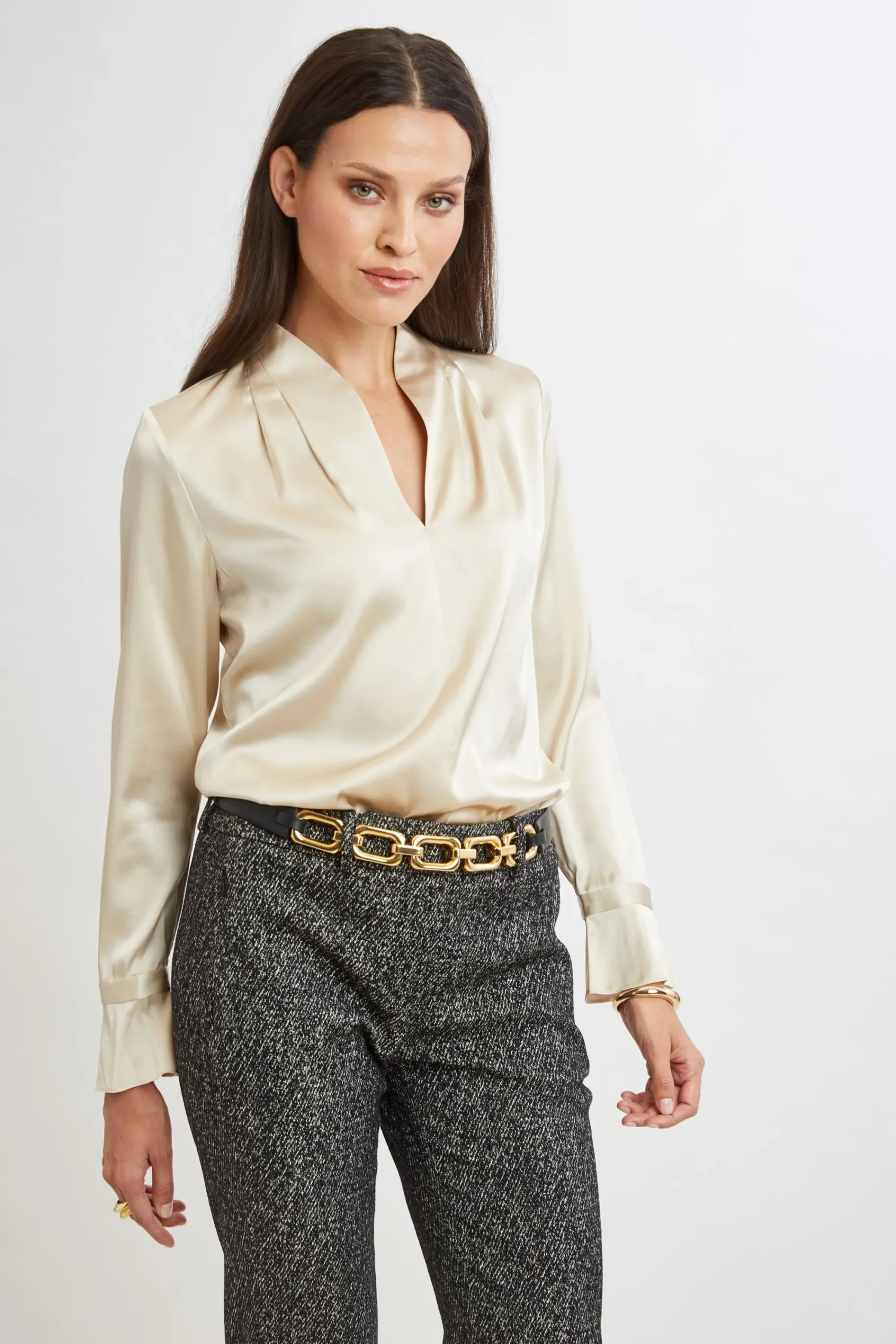 Effortlessly chic, this shirt is destined to become a favorite. Luxurious Silk Satin elevates this minimalist top. With its contour neckline, soft pleat detail u0026amp; tiered ruffle cuffs, this essential piece will take you from Fall to Spring. Elie Tahari Exclusive Long Sleeve Contour Neck Ruffle Shirt 93% Silk 7% Elastane Runs true to Size Length From Shoulder to Hem: Back 27.25″L, Sleeve: 32.5″L (approx. length for size S) Model is 5’9″ and wearing size XS Dry Clean Only Imported Style #: E9053524